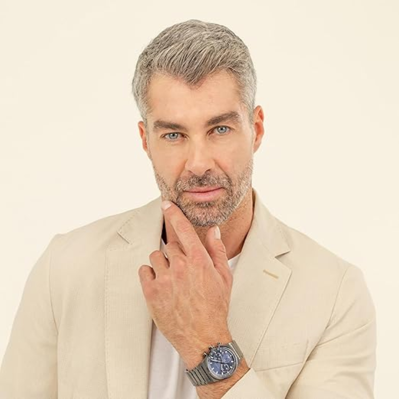 This watch boasts a sleek 41mm quartz fashion chronograph movement, perfect for the modern man. The 10.35mm case thickness and 21 mm band width provide a comfortable and stylish fit, while the ionic plated grey steel case coating and mineral crystal material add a touch of sophistication. The striking blue dial and Ionic plated grey steels trap only add to the appeal, and with a water resistance of 5 ATM and a push-button deployment clasp, this watch is both functional and fashionable.