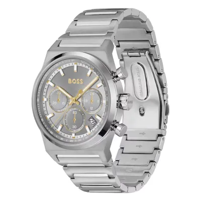 The HUGO BOSS 1514221is a sophisticated stainless-steel chronograph designed for men who appreciate modern, sporty-luxury aesthetic. It features a brushed steel bracelet and case, paired with a sleek grey dial accented by gold-tone hands and hour markers. Three sub-dials provide chronograph functionality, while a subtle date window sits between the 4 and 5 o’clock positions. The tachymeter scale on the inner bezel gives it a dynamic, performance-driven edge. Perfect for everyday wear or elevated occasions.