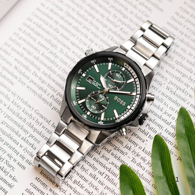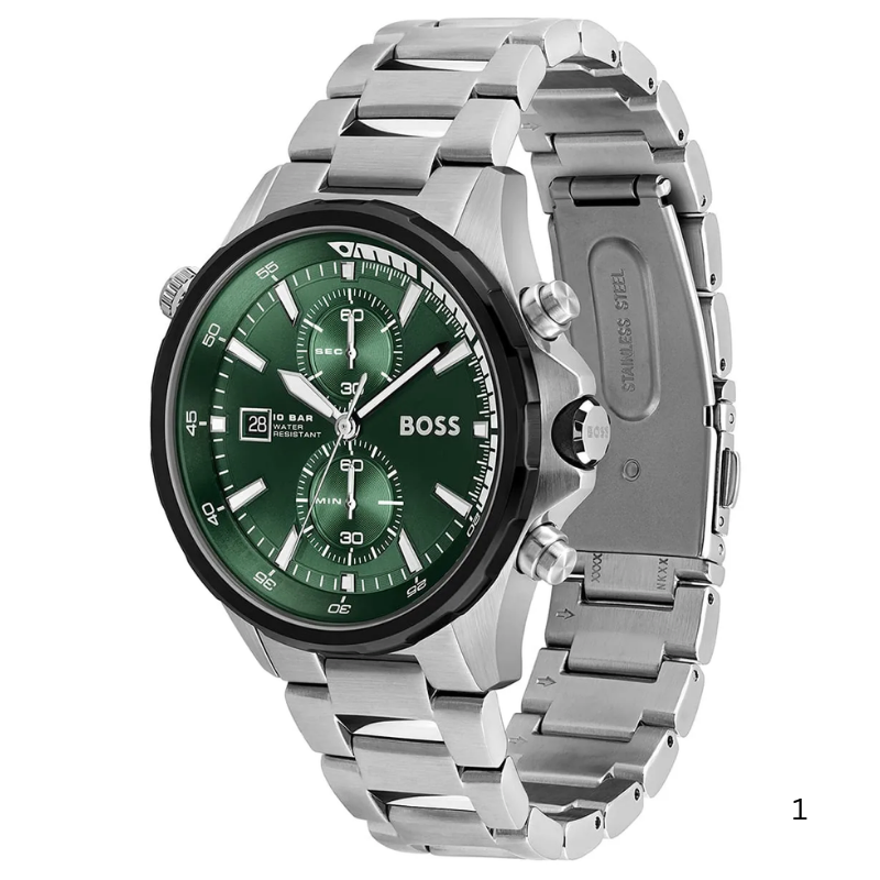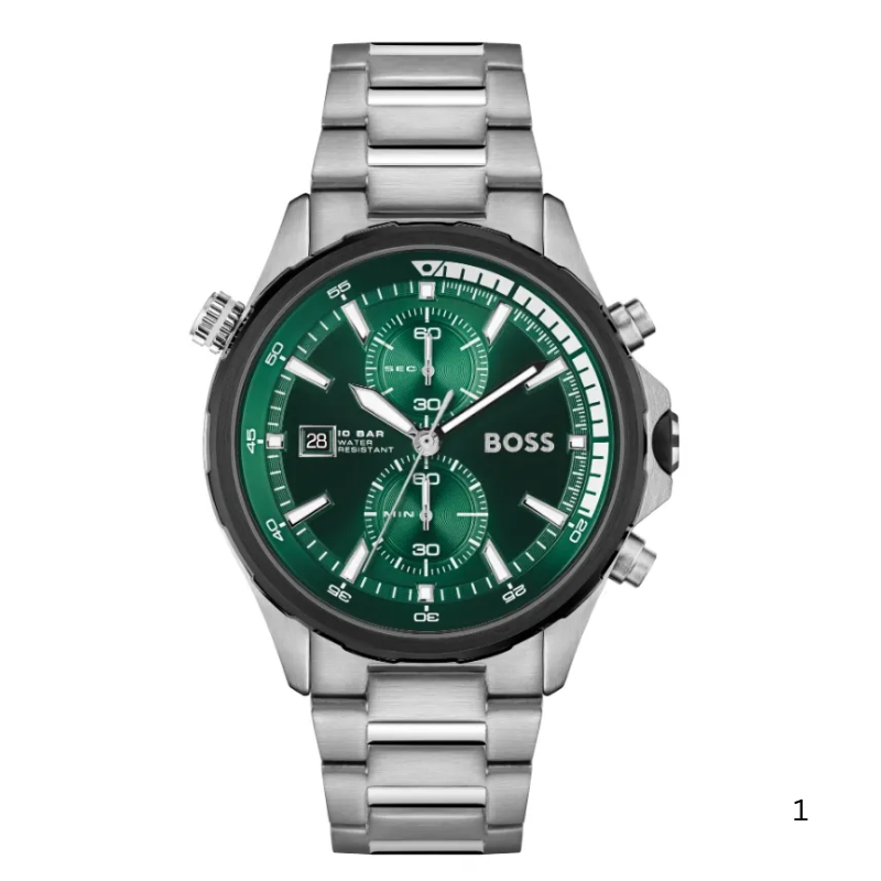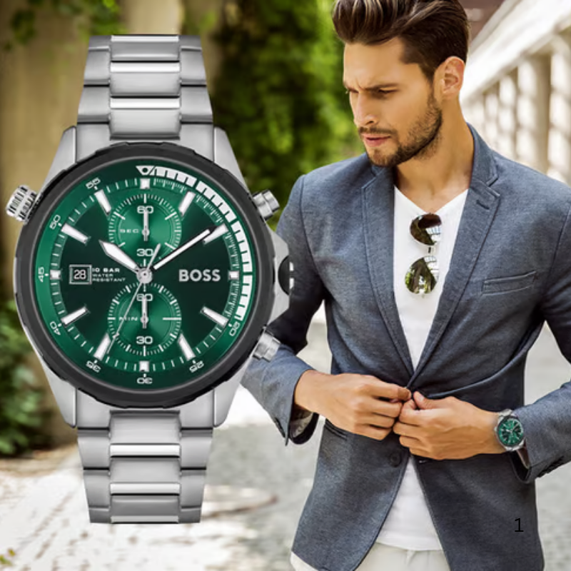 The HugoBoss Globetrotter is a commanding men’swatch that combines robust functionality with a striking design. Featuring a46mm round stainless steel case, this timepiece showcases a bold green dialthat contrasts beautifully with a fixed black bezel. Powered by a Japan quartzmovement, it offers precise timekeeping and includes chronograph functionsalong with date, hour, minute, and second indicators