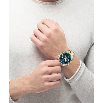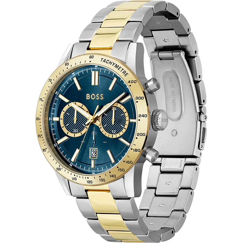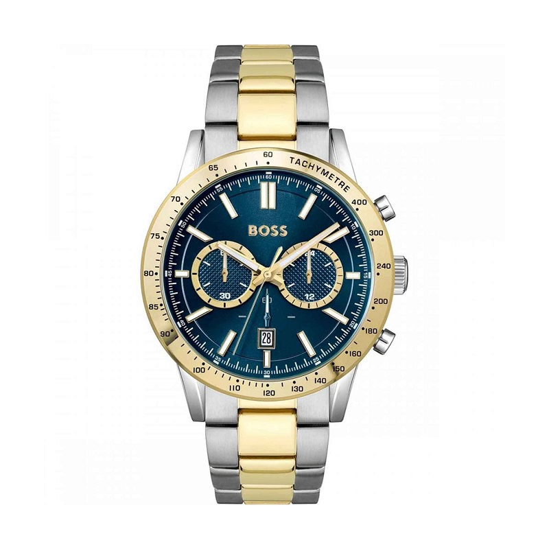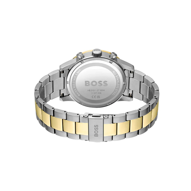 Designedwith excellence, this timepiece from HUGO BOSS is set with classic elegance inits smooth round case and features chronograph sub-dials as well as a datedisplay window and a tachymeter on the bezel converting time into speed. Highlightingyour wrist with its metal bracelet strap, the combination of brushed andpolished finishes makes for a stunning appearance.