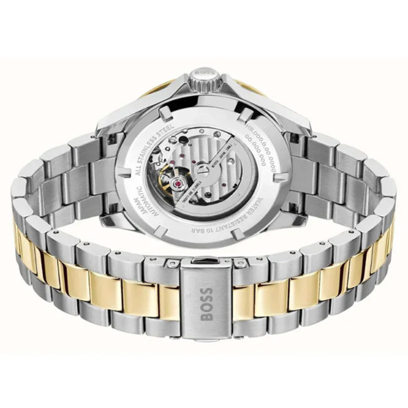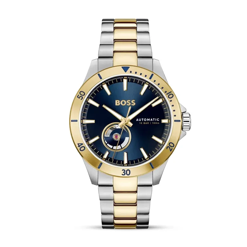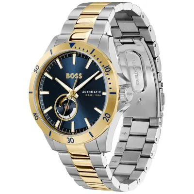 The two-tone BOSSTroper Automatic 1514201 automatic wristwatch combines functionality withsophisticated style, making it a stand-out accessory for any occasion. The caseof this automatic watch is 42 mm wide and 12.3 mm thick and made of stainlesssteel, and through the transparent back case you can admire the automaticmovement with 21 jewels. The front also has an open heart. The navy blue dialis protected by durable mineral glass. The dial is adorned with luminescenthands and indices, making it easy to read the watch in the dark. Thesilver-coloured steel bracelet is 21 mm wide at the attachment point. The BOSSTroper Automatic 1514202 is water resistant to 100m/10atm, making it suitablefor swimming and snorkelling.