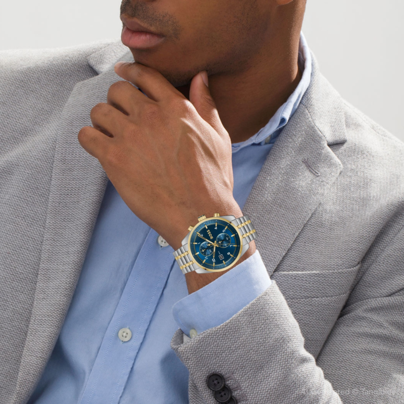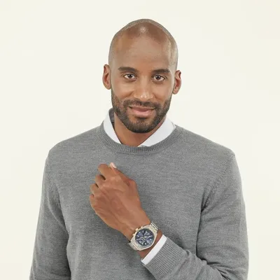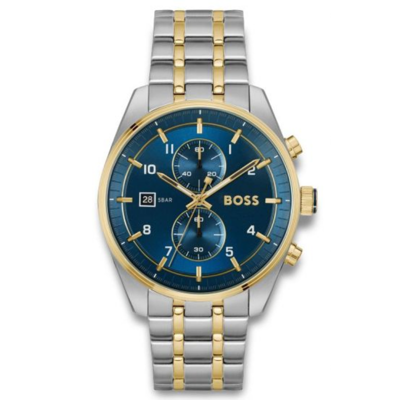 The BOSS SkytravellerQuartz Fashion Chronograph features a striking blue round dial set in astainless steel case accented with ionic plated thin gold steel. Paired with agold-colored band, this men's watch combines sophisticated design with precisechronograph functionality, making it an excellent choice for those who seekboth style and performance in a versatile timepiece.