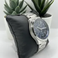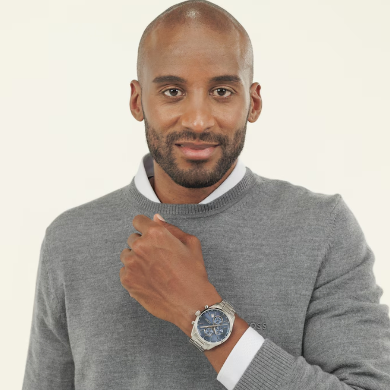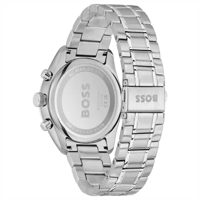 Hugo Boss Grand Prix1514226 men's watch made of stainless steel with analog quartz movement. It has a 44 mm diameter case with a blue dial and white luminous hands and indices. The watch is presented on a stainless steel link bracelet with a double push-button deploy ant clasp.