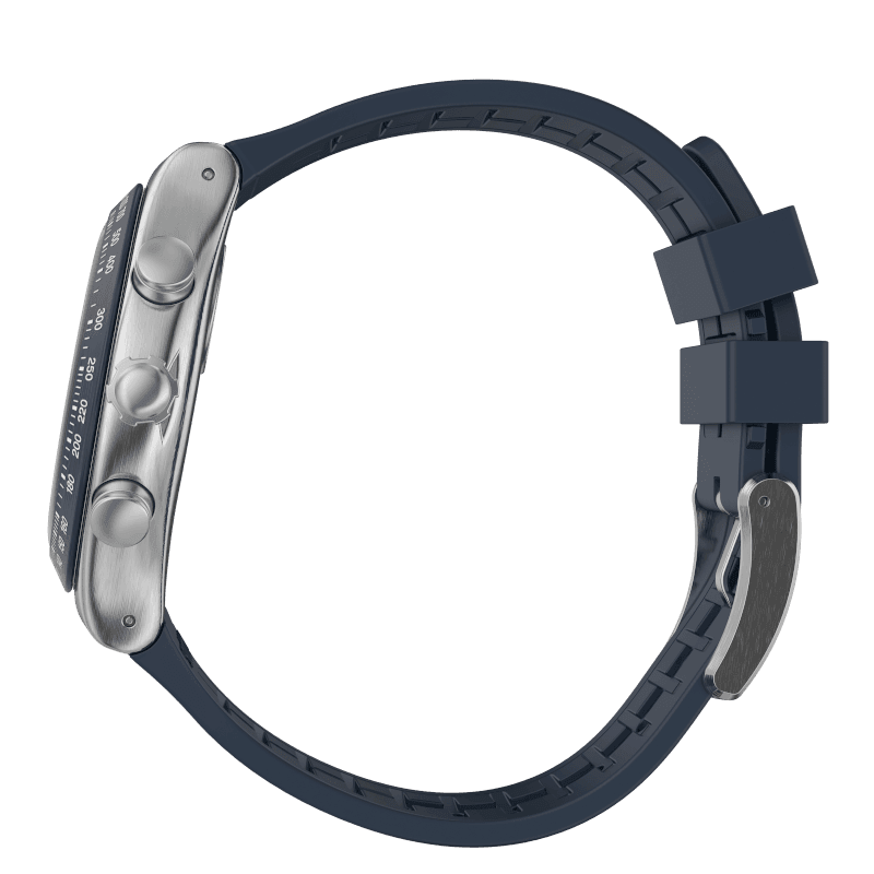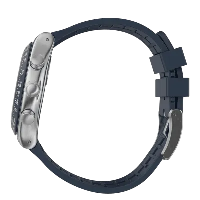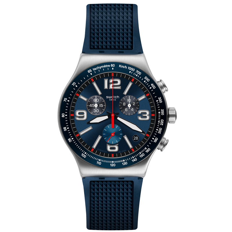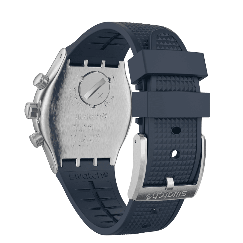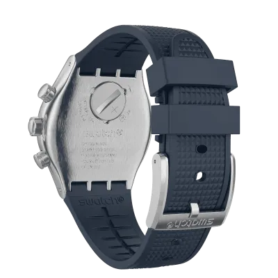 Plug into BLUE GRID , a vivid blue chronograph with a structured rubber strap and a functional blue dial with silver-colored Swatch Appliques.