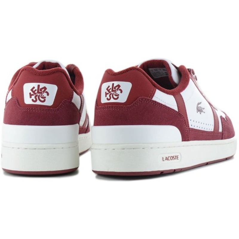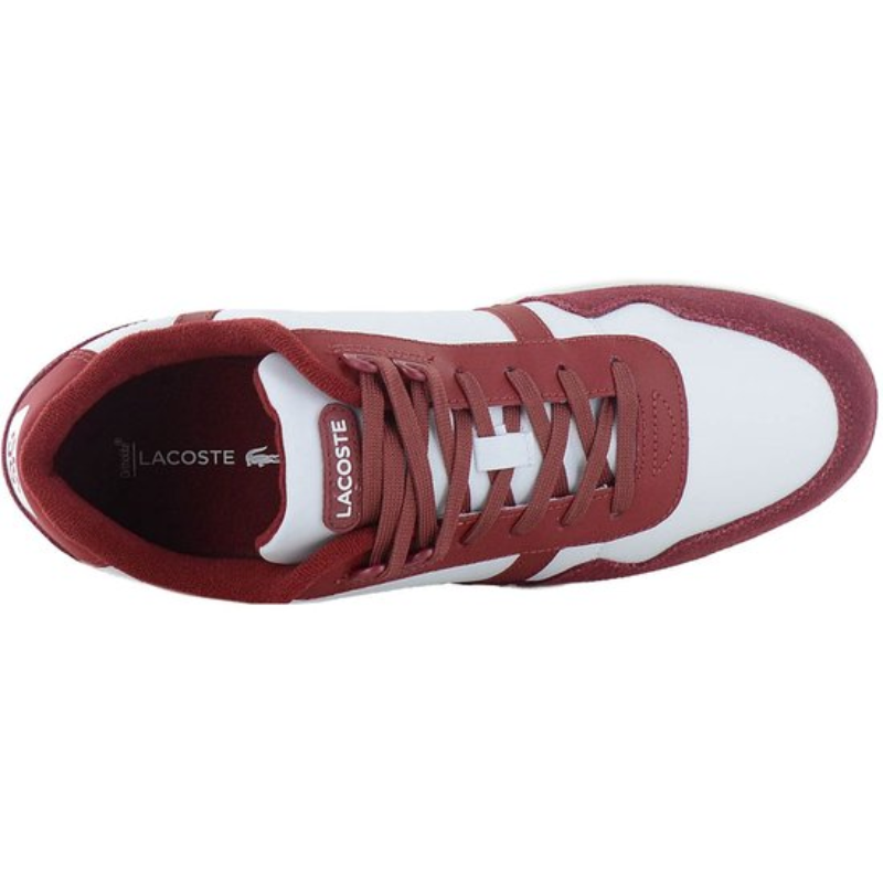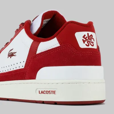 This Lacoste men's sneaker has a regular fit and a leather upper. It features a lace-up closure and a flat sole. It has a mesh lining and a removable, moisture-wicking foot bed. Details of this sneaker: Style: Lacoste T-Clip. Comfortable and cushioned sole. Retro 80s crocodile detail on the side.