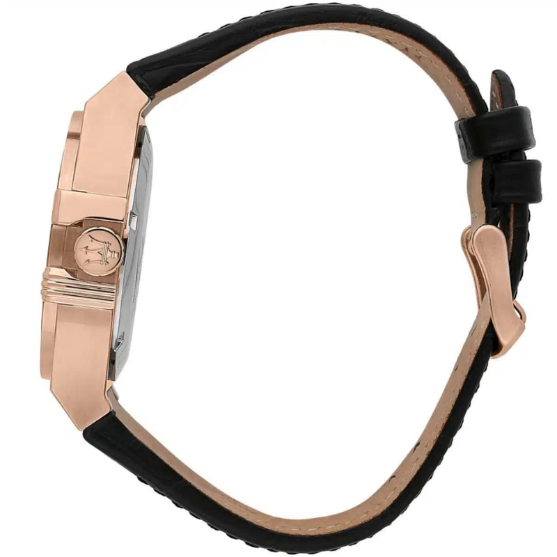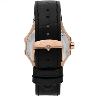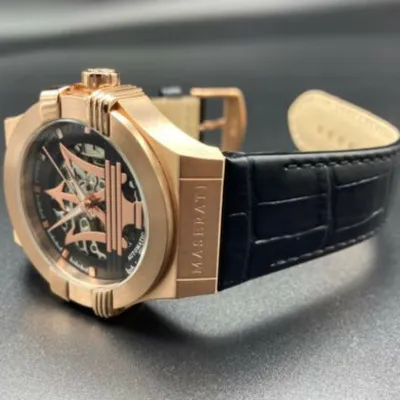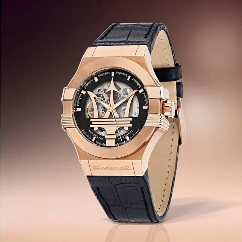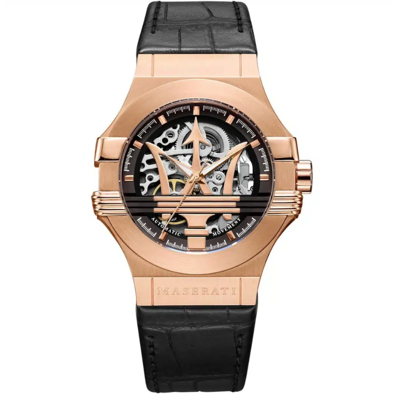 High-end men's watch with a black leather band, skeleton-style dial, and striking gold-tone casing. Ideal for business and formal wear, this watch is made with durability, style, and accurate timekeeping in mind.