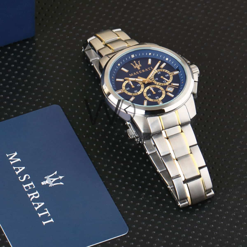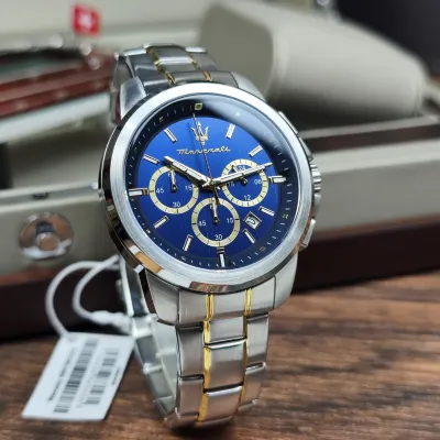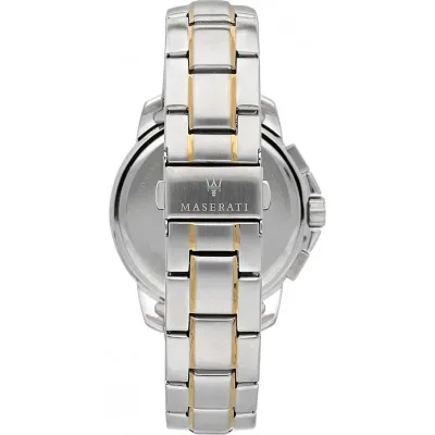 Astately and brazen ensemble, the Maserati Successo men's watch is a one of akind masterpiece. The stainless steel timepiece is infused with sleeksophistication and houses a round dial. The dial features stick indices, subdials,a date tracker and the iconic Maserati logo at the 12 o'clock marker.