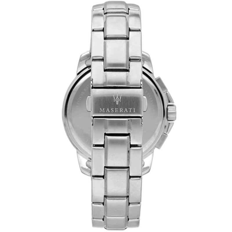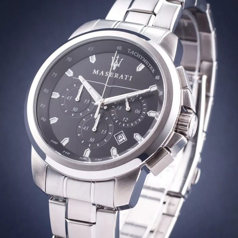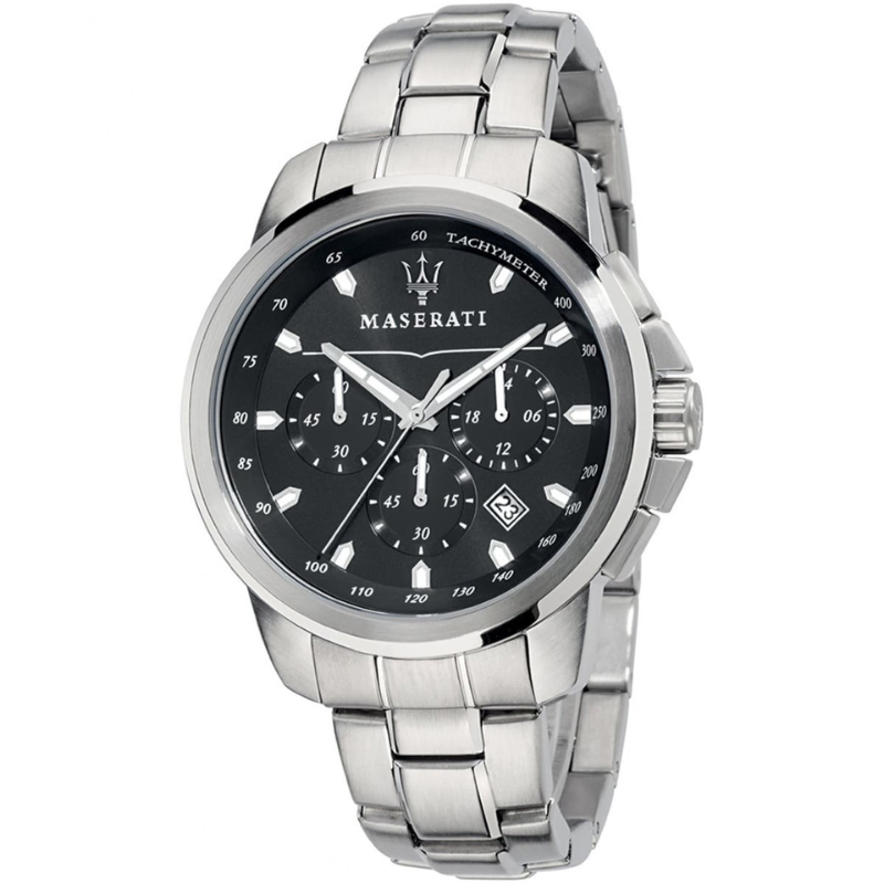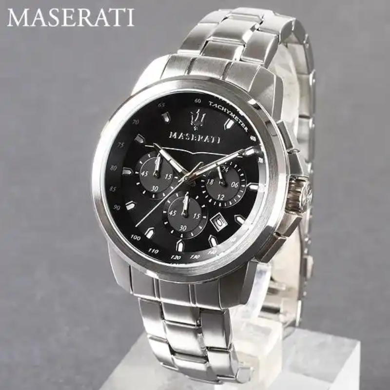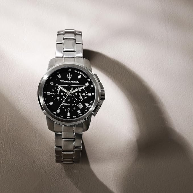 Maserati Success is a men's watch that goes well with any outfit. The unique design combined with the best quality materials guarantee a perfect look in every situation. The quartz movement is accountable for time precision. The case of the timepiece is made of durable stainless steel in black. A silver bracelet made of steel is easy to use and perfectly matches other elements of the watch. The black dial is protected against shocks and scratches by a mineral crystal. The watch is suitable for showering and bathing due to a water resistance of 50 meters. Maserati is an authentic watch that you can purchase in our store. The model is packed in a branded box and comes with a manufacturer's warranty.
