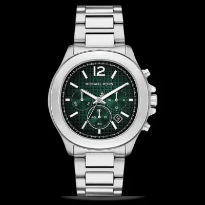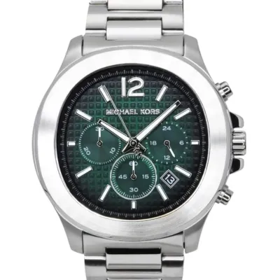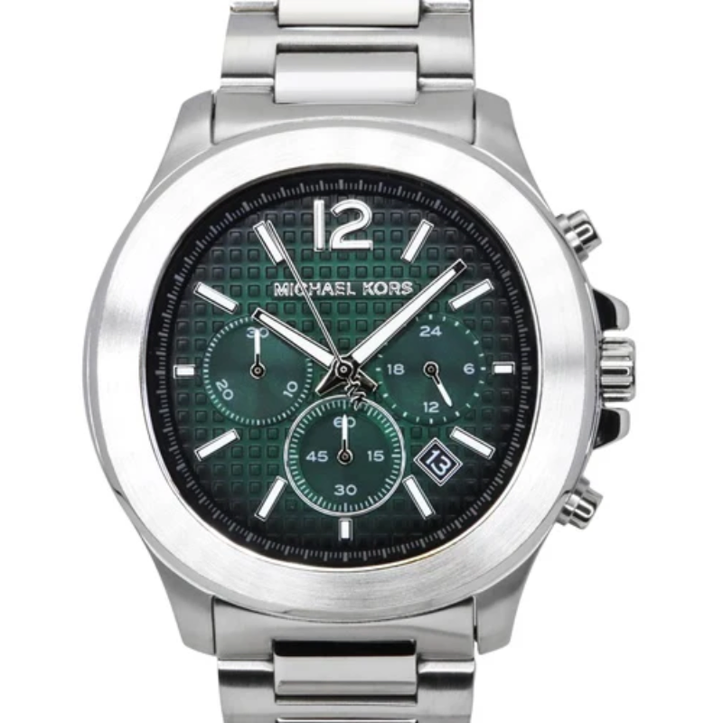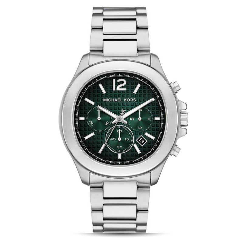 The Michael KorsMK9191 Chronograph Men's Watch has a date display, multifunction chronograph sub-dials, a stainless steel case and band, and a deep green textured dial. A flawless fusion of everyday durability, precision quartz movement, and contemporary luxury.