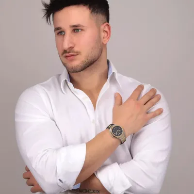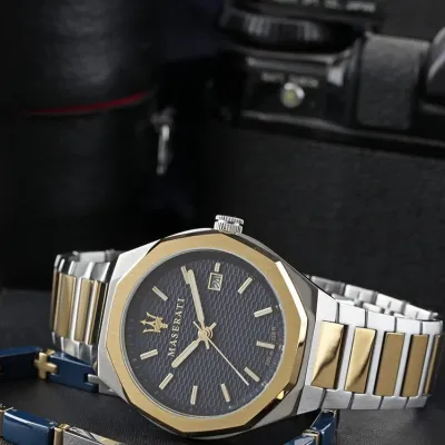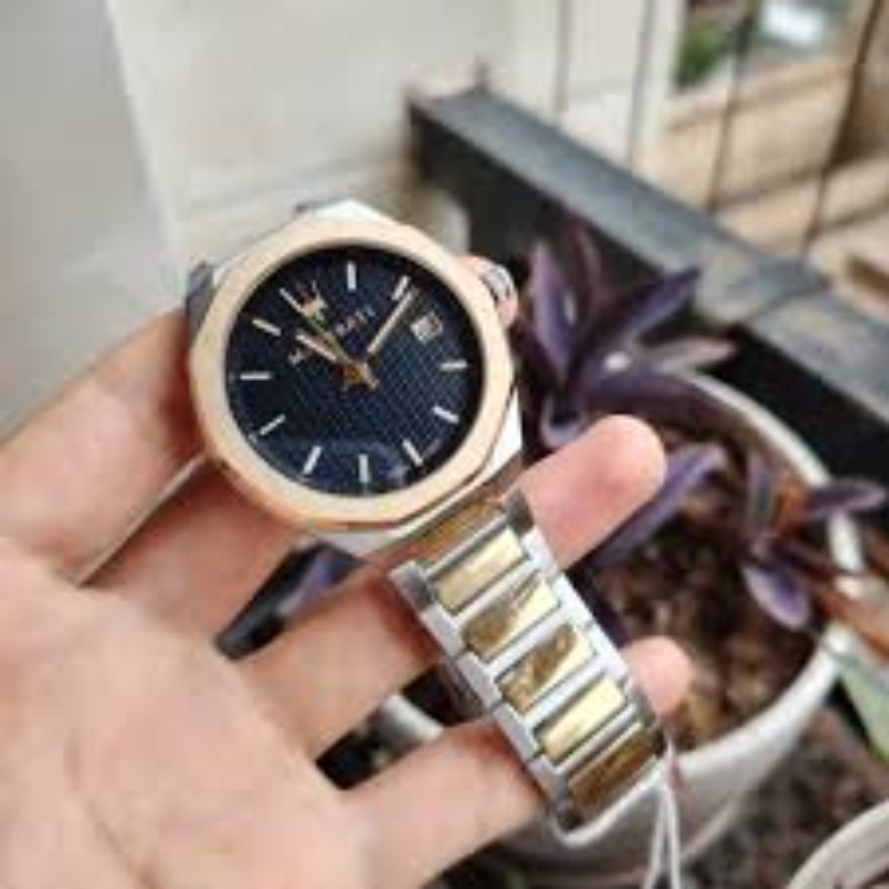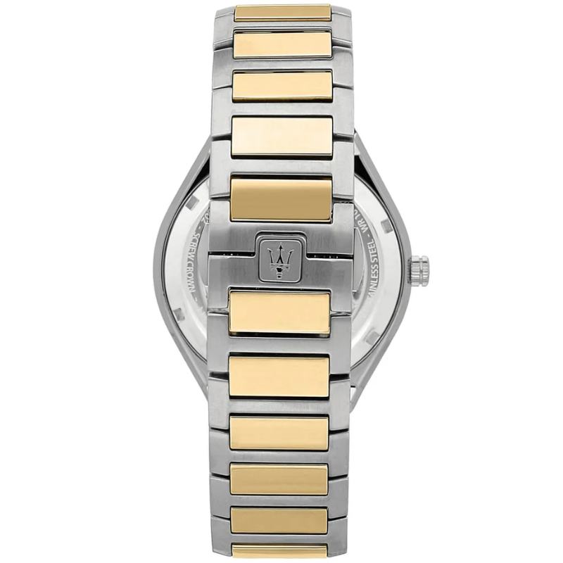 The new Maserati Stile collectionplays with clean and well-defined geometry. This watch is characterized by a45mm steel case and bezel with exposed Silver screws. The open date perfectlyaccompanies the silver colored dial with blue details, while the strap reflectsthe steel of the other elements. Screw-down crown and back, Water Resistant 10ATM.