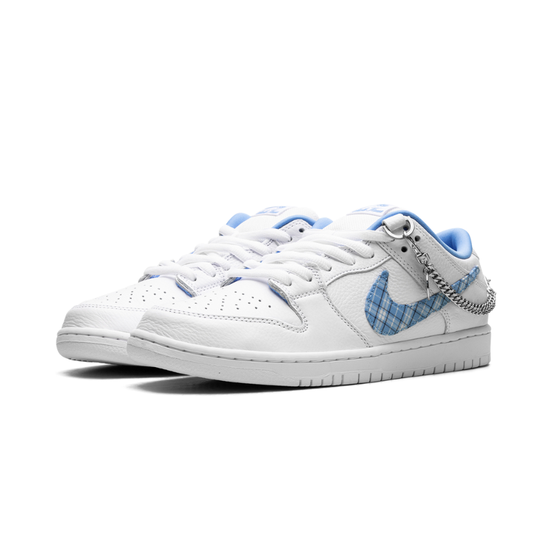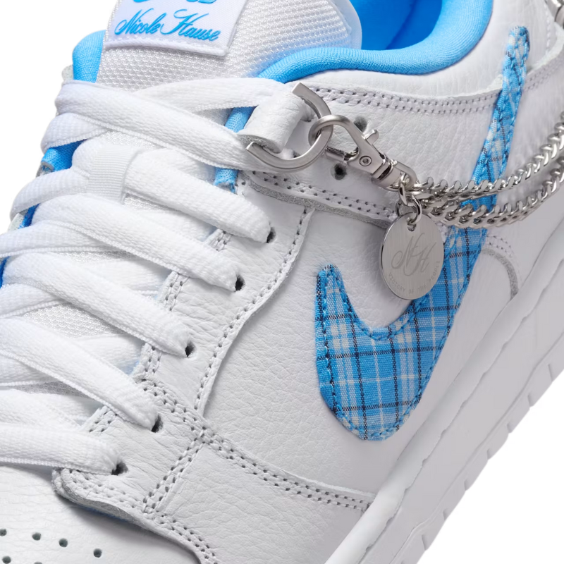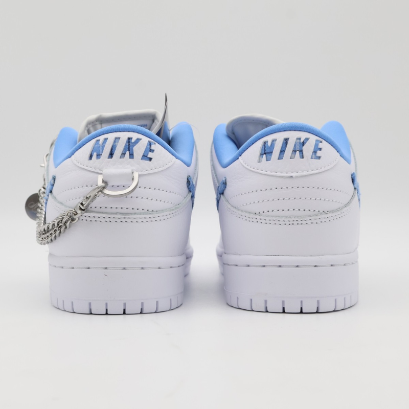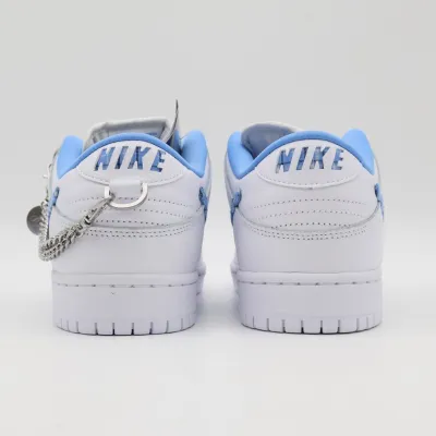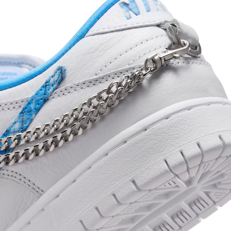 Step into bold style and comfort with the Nike Air Jordan Low FZ1289-200. Featuring a clean whit base with striking sky-blue accents, this sneaker blends premium materials and timeless Jordan heritage. The unique patterned Swoosh and signature chain accessory make it stand out, while the soft cushioning delivers all-day comfort. Perfect for casual wear or elevating your street look, this pair is a must-have for sneaker enthusiasts.