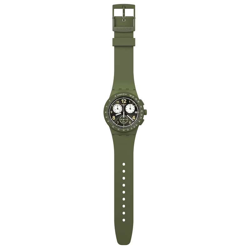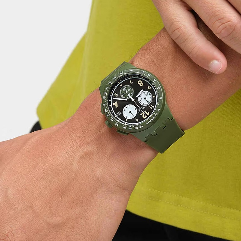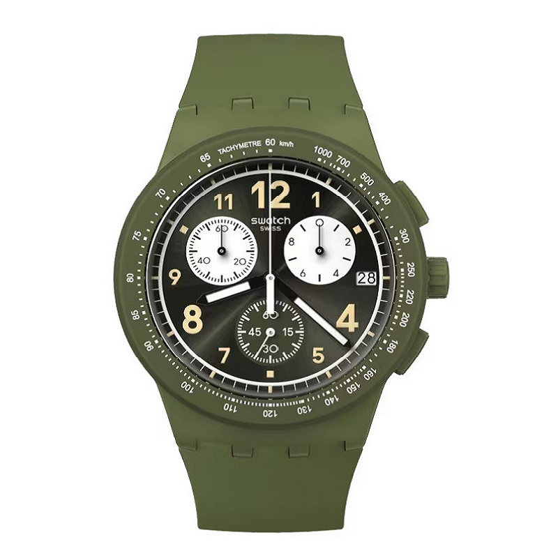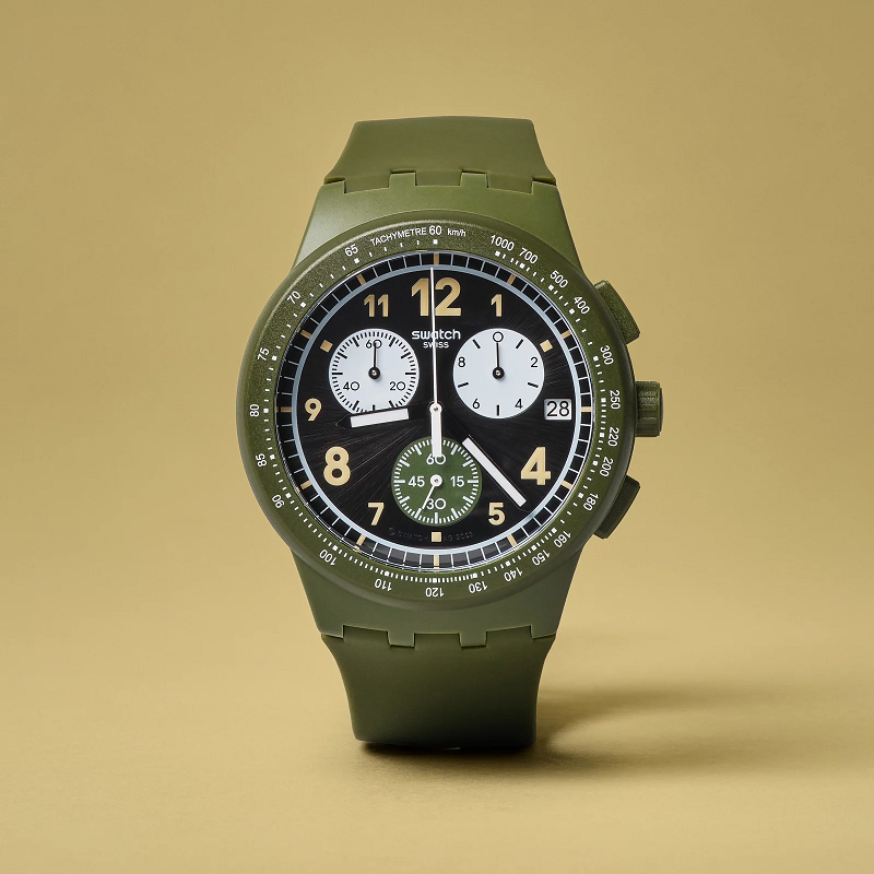 This dark khaki-green chronograph features a sun-brushed black
