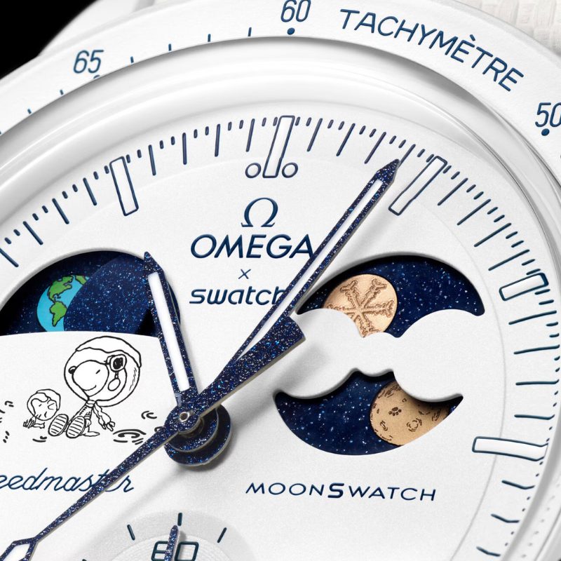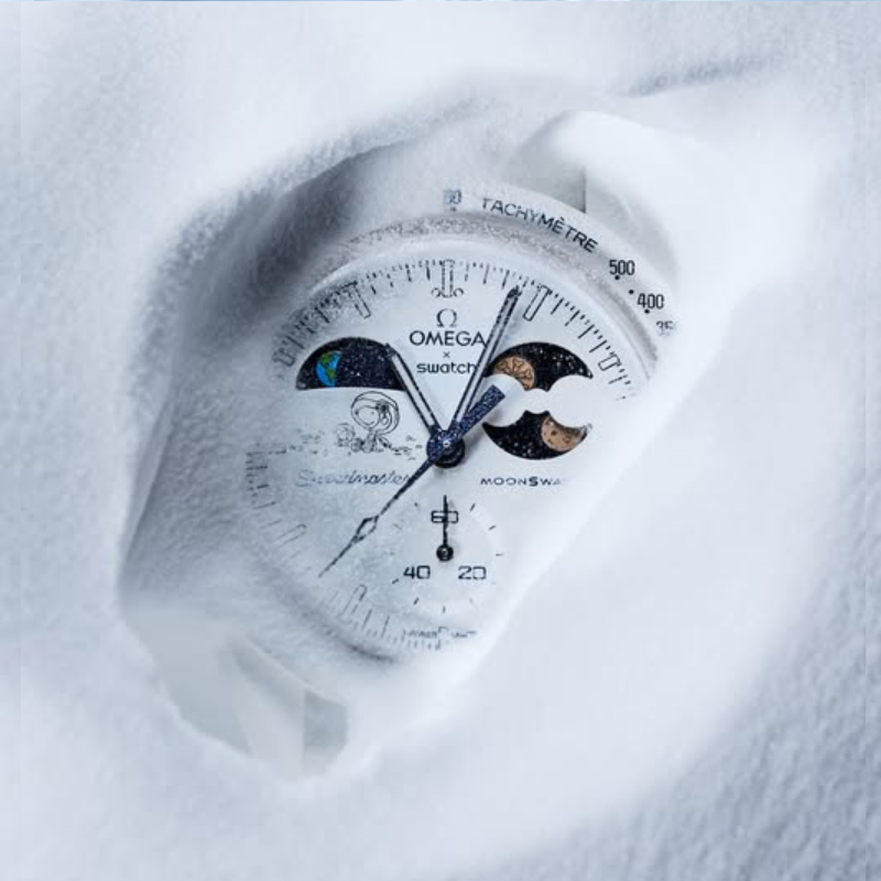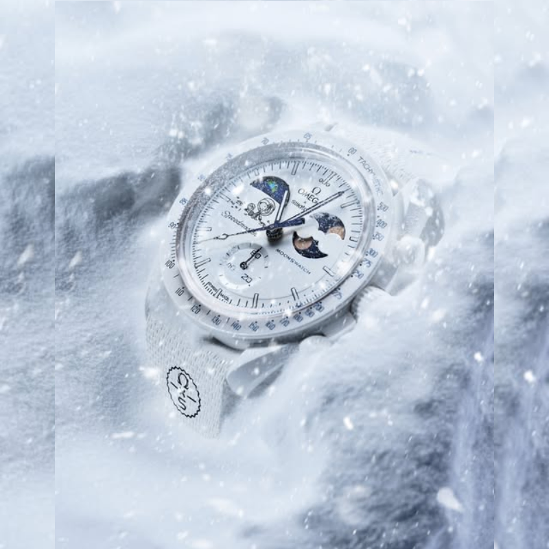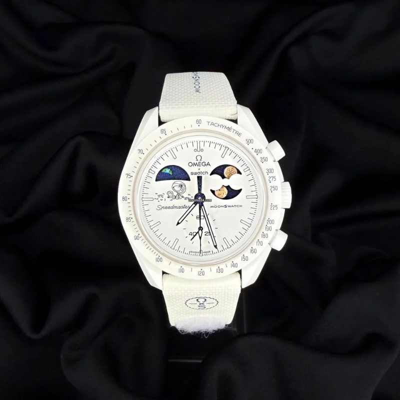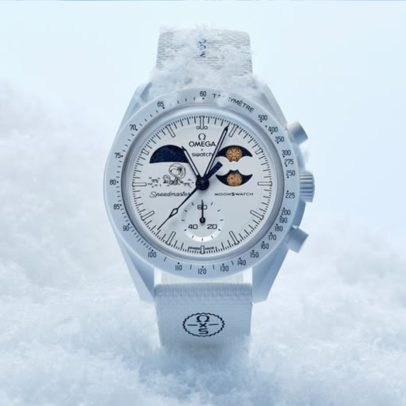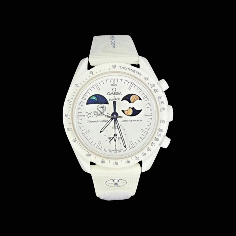 The Omega x SwatchBio ceramic Moon Swatch Mission to the Moon phase Snoopy (SO33W701L) combinesiconic Speed master heritage with playful space storytelling. Featuring a moonphase complication, lightweight bio ceramic case, and space-inspired details,this white chronograph watch is a must-have for collectors and spaceenthusiasts.