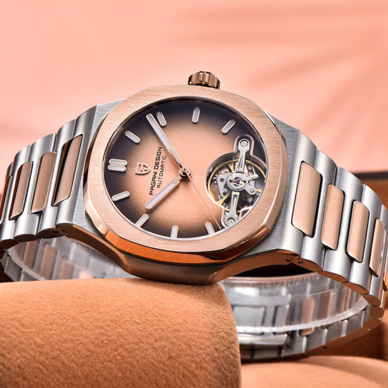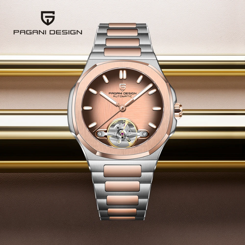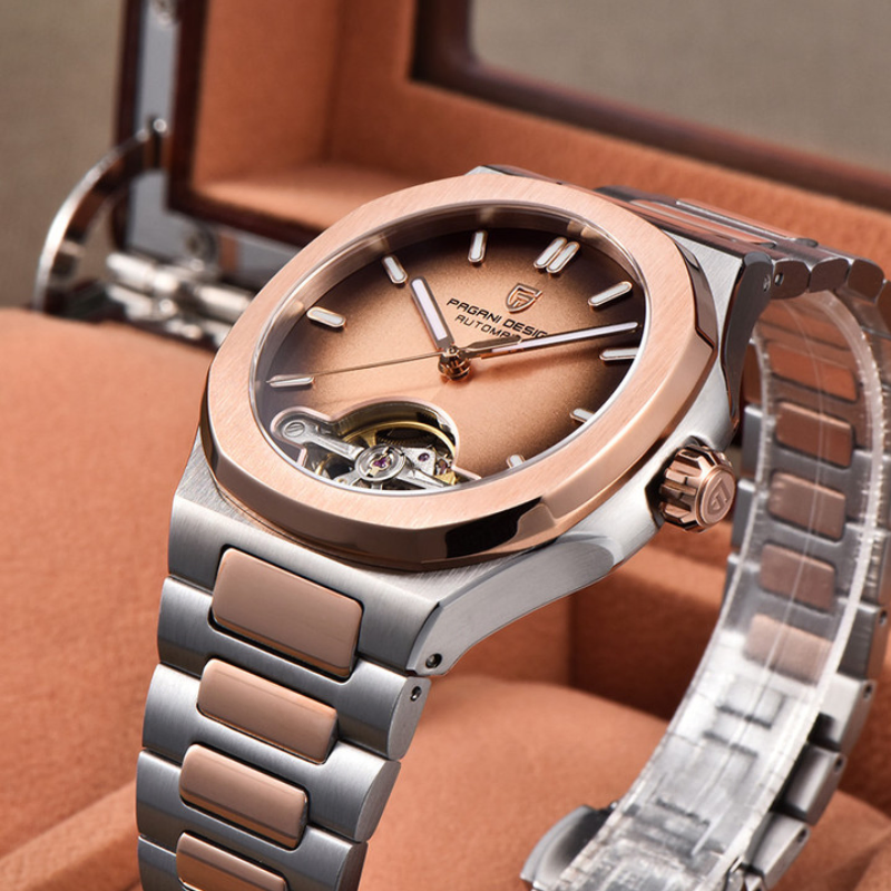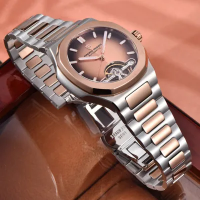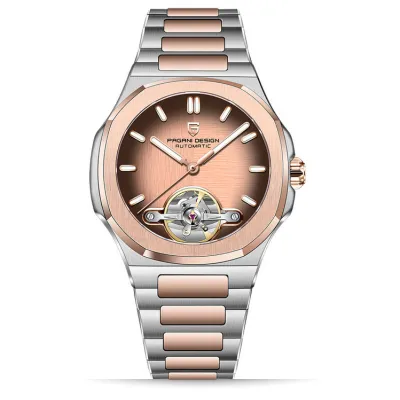A stylish watch that blends style and practicality is the Pagani Design (PD-YS025). It has a modern yet timeless appeal thanks to its eye-catching two-tone stainless steel case and band. Without the need for a battery, the watch's accurate automatic movement ensures dependable timekeeping. The scratch-resistant sapphire crystal adds durability and clarity, and the elegant dial is supplemented by luminous hands and markers for improved readability.