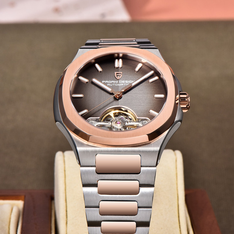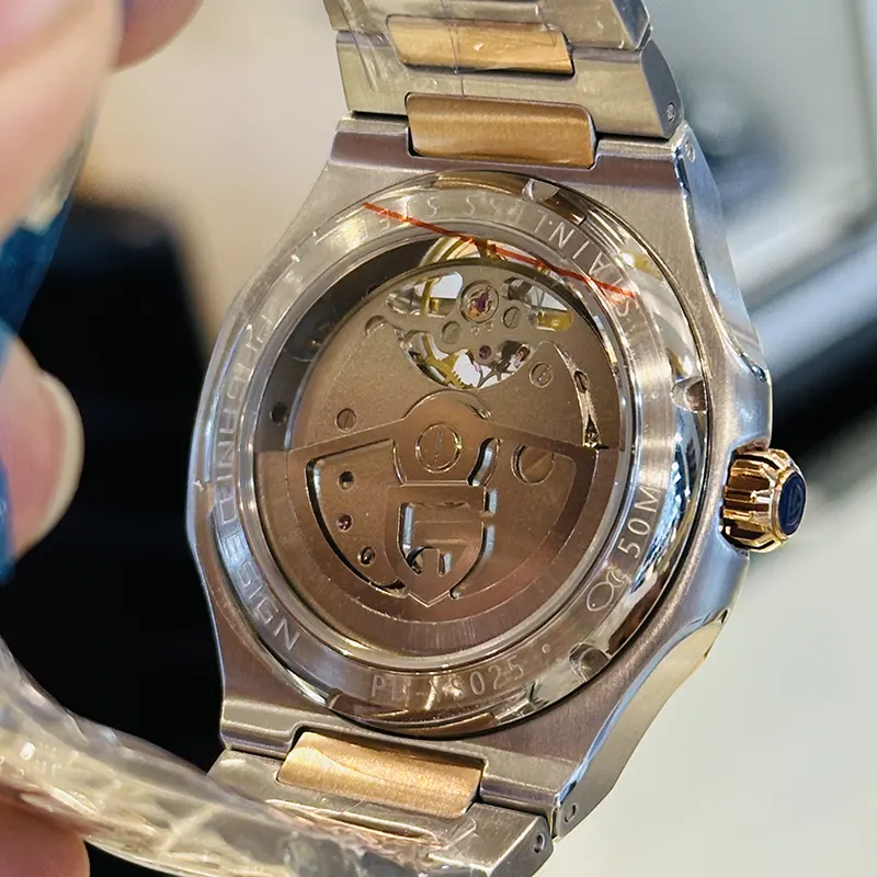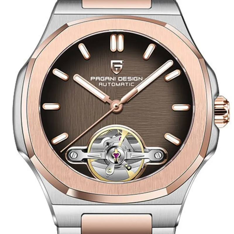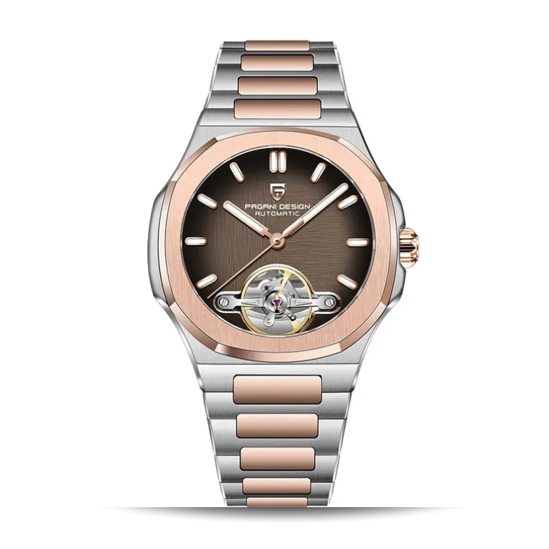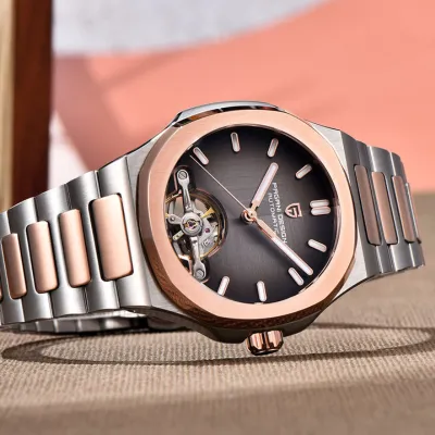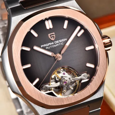 A stylish watch that blends style and practicality is the Pagani Design (PD-YS025). It has a modern yet timeless appeal thanks to its eye-catching two-tone stainless steel case and band. Without the need for a battery, the watch's accurate automatic movement ensures dependable timekeeping. The scratch-resistant sapphire crystal adds durability and clarity, and the elegant dial is supplemented by luminous hands and markers for improved readability.