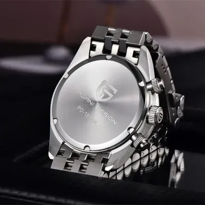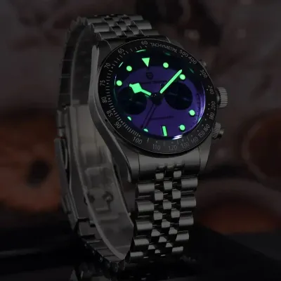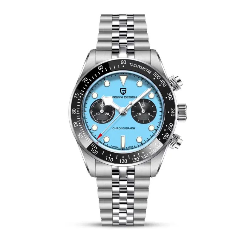 The elegant and dependable Pagani Design PD-1813 men's chronograph watch features a Tiffany blue dial, a stainless steel case and strap, sapphire crystal, and 100 meters of water resistance.