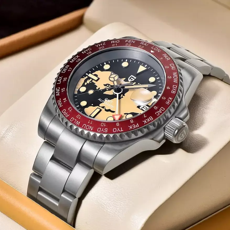 Pagani Design PD-1758 men’s automatic GMT watch with world map dial, stainless steel build, sapphire crystal, and bold explorer-inspired style.