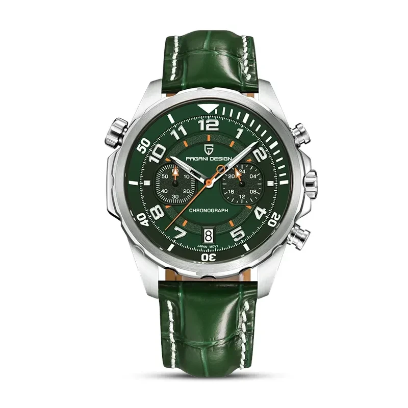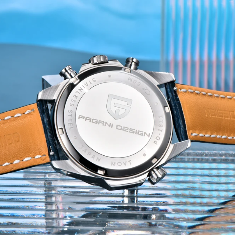 The PAGANI DESIGNPD-1811 embodies both contemporary accuracy and traditional style. This watch has an amazing 10 bar water resistance, is covered by a sapphire crystal, and is powered by a precise Japanese quartz movement (battery supplied). Its stylish leather strap complements the dial's bright hands and attractive Arabic numerals. Superior dependability in a distinctly opulent style.