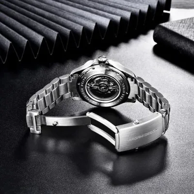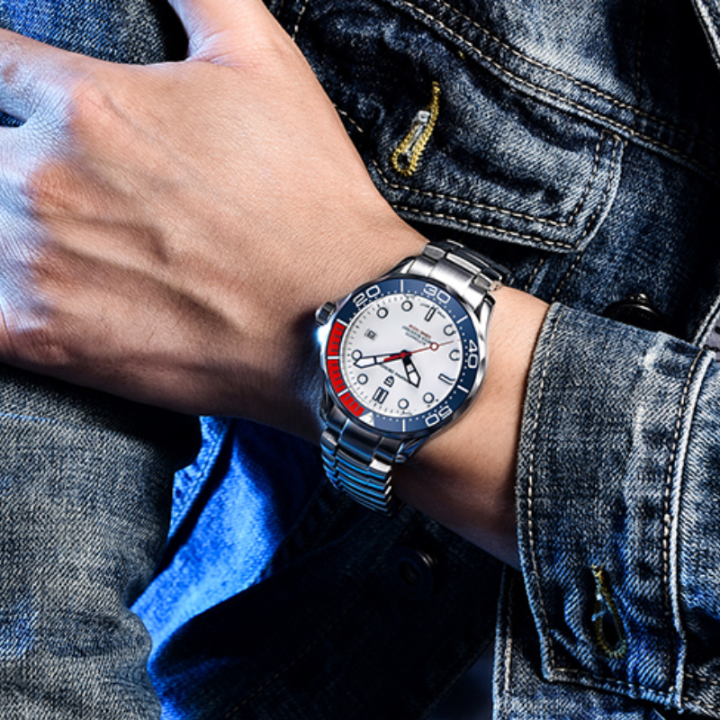 PD-1667 Automatic Dive Watch features a clean white dial, blue-red rotating bezel, stainless-steel case and bracelet, and reliable automatic movement. Water-resistant and built for durability, it combines sporty performance with everyday elegance.