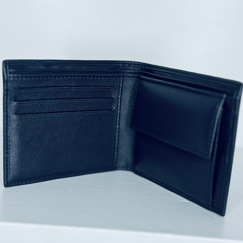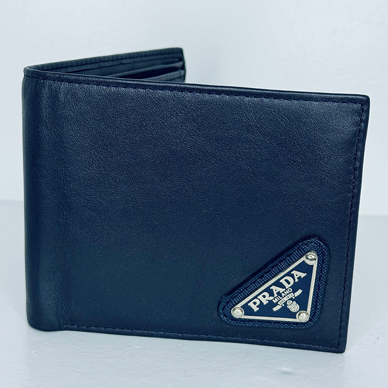 Crafted from luxurious navy Italian leather, this PRADA bifold wallet harmonizes classic design with modern utility. Inside, you'll find multiple card slots, a discreet ID window, dual bill compartments, and elegant stitching—all reflecting Prada's impeccable craftsmanship. A refined accessory for the gentleman who appreciates signature style and everyday refinement.