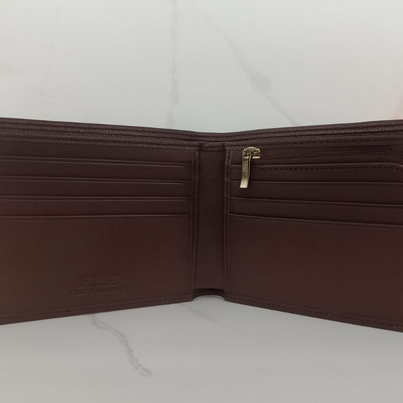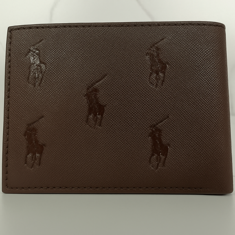 The Polo Ralph Lauren Men's Brown Leather Wallet features a premium textured leather design with iconic embossed Polo logos. With multiple card slots, a secure zip pocket, and refined finish, it’s the perfect blend of luxury and everyday practicality.