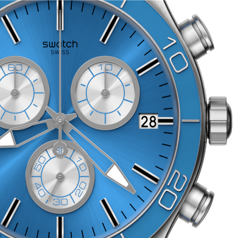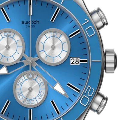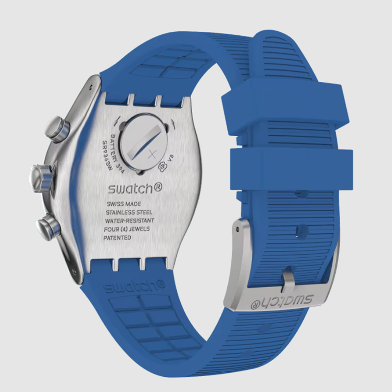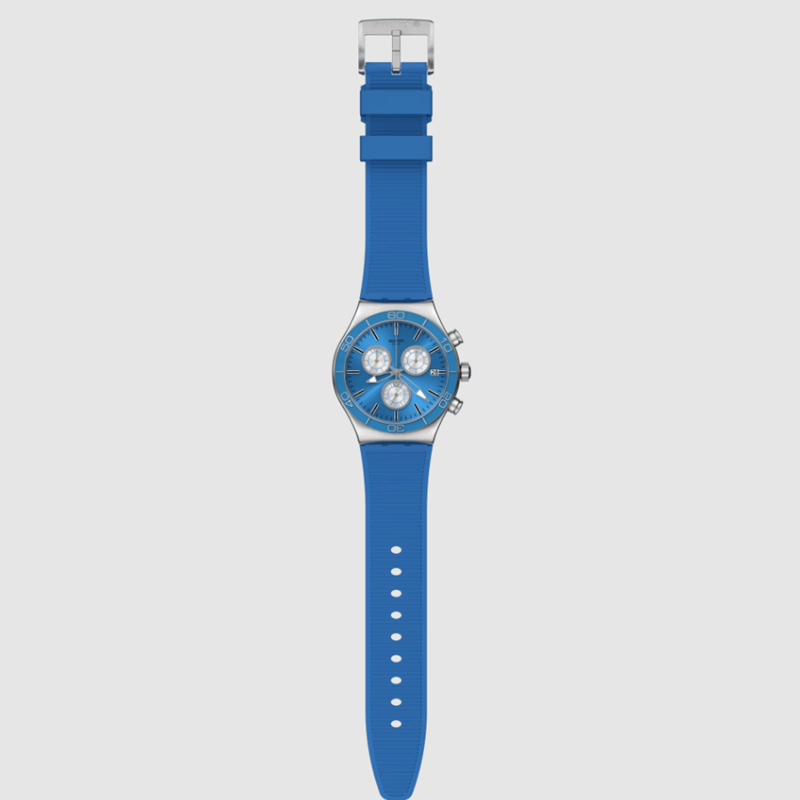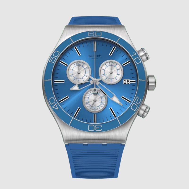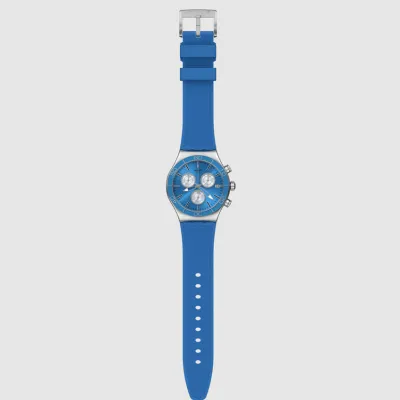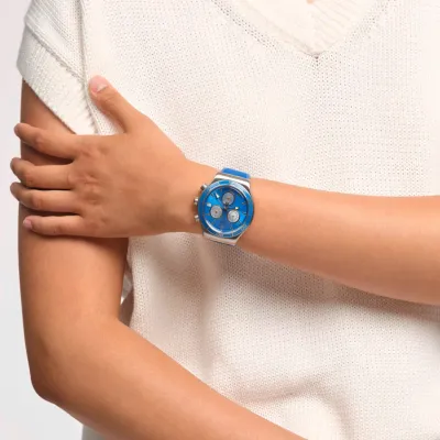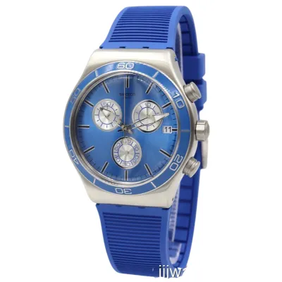 Thisstainless steel chronograph watch features a blue rubber strap with horizontallines and a stainless steel pin buckle strap set in a brushed stainless steelcase. But the star of this IRONY CHRONO watch is the dial, with its bluesun-brushed finishing, silver counters and black applique indexes, minute trackand logo. The finishing touches are a date indicator at 3 o’clock on the dialand silver numbers and indexes on the blue stainless steel bezel.