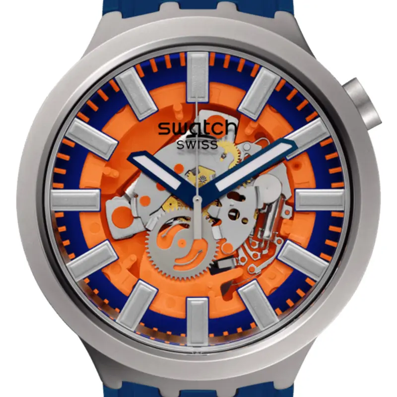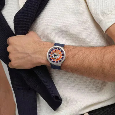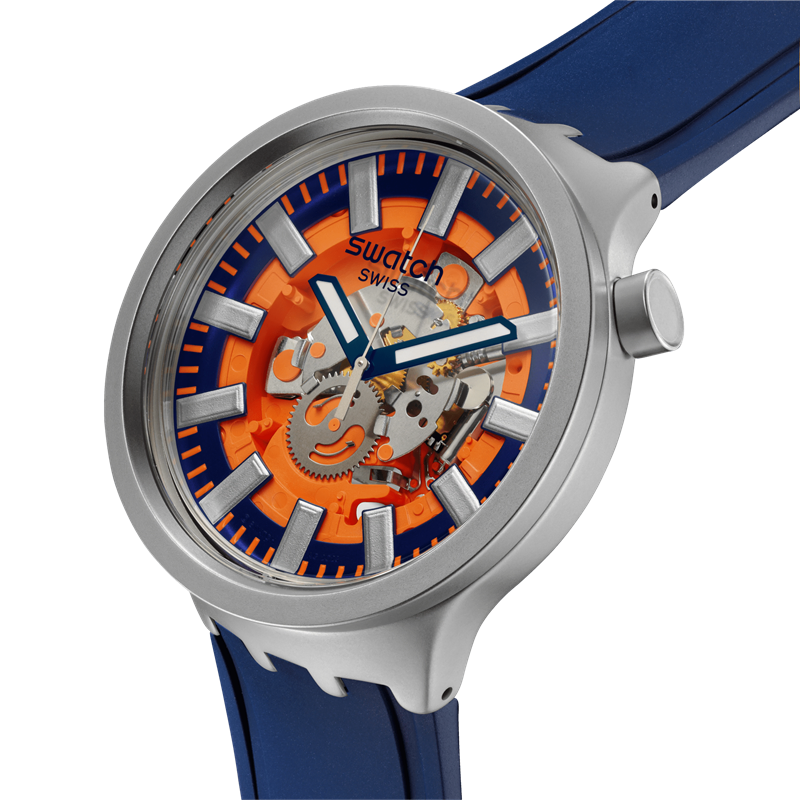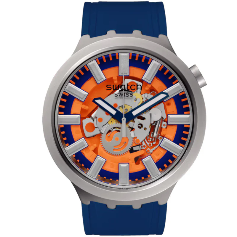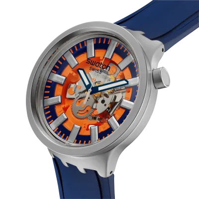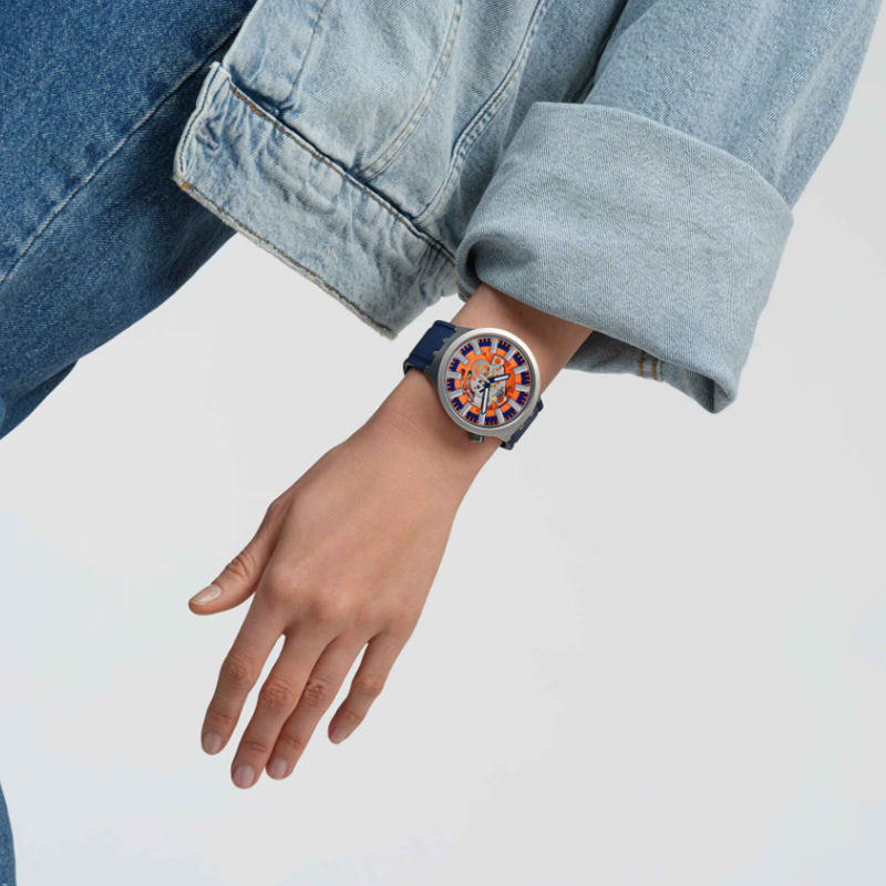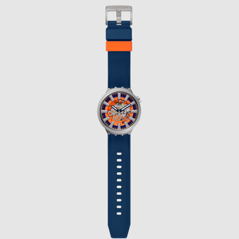 time. The dark blue strap with orange and dark blue loops and stainless steel