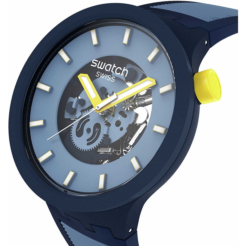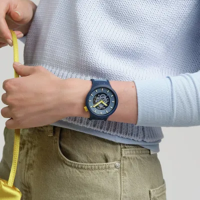 This oversizewatch stands out with its light blue open dial featuring 3D indexes with whiteand yellow print, yellow hour and minute hands with glow-in-the-dark effect, awhite seconds hand and light blue movement elements, all under biosourcedglass. The matte dark blue biosourced case with matching bezel is complementedby a matte dark blue strap with matte light blue structure, matte dark blue andlight blue loops and a matte dark blue half-buckle.
