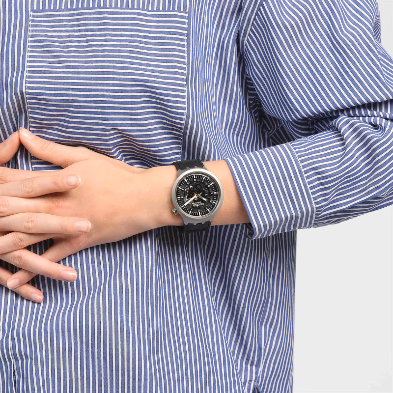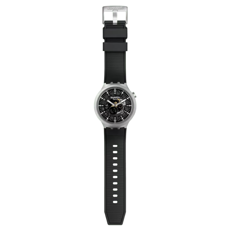 Swatch SB07S105 Dark Irony oversized men’s watch featuring a47mm case, skeleton black dial, Swiss quartz movement, and durable siliconestrap—perfect for bold, modern everyday style.