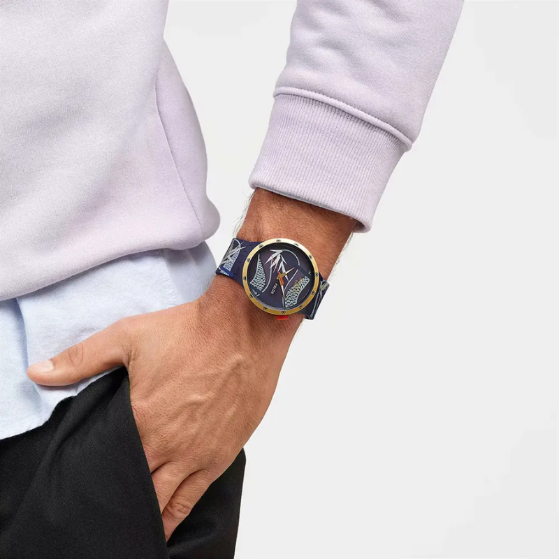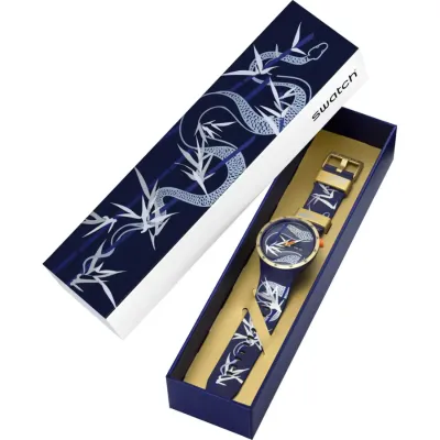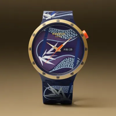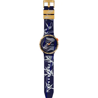 Experience Swisscraftsmanship blended with bold artistic design. The Swatch SB05Z700 is morethan just a watch – it’s a wearable piece of art. Featuring a deep navy dialwith intricate wave and bamboo patterns, accented by a luxurious gold-tonebezel and vibrant orange crown, this watch stands out from the crowd. Craftedwith precision, the SB05Z700 comes with a high-quality Swiss quartz movement,ensuring accurate timekeeping every day. Its lightweight yet durableconstruction makes it perfect for daily wear, while the unique strap artworkseamlessly extends the dial’s design, creating a cohesive and eye-catchinglook.