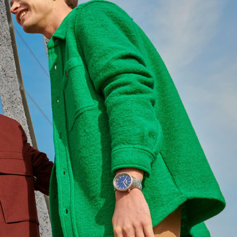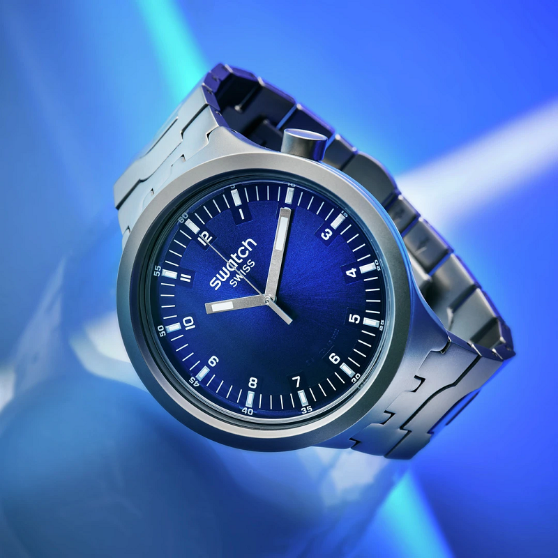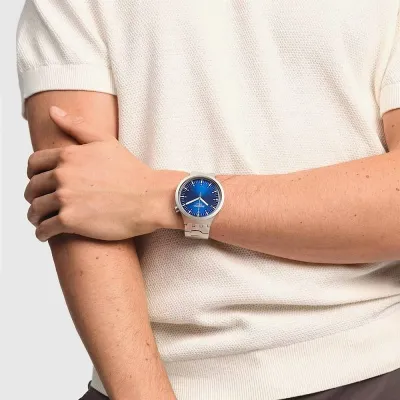 This oversized stainless-steel watch showcases a navy-blue dialwith a sun-brushed finish which is complemented by a stainless steel adjustablebracelet, along with a sandblasted case and bezel for a polished look. •Powered by the quartz movement. • Presented on a silver stainless steelbracelet