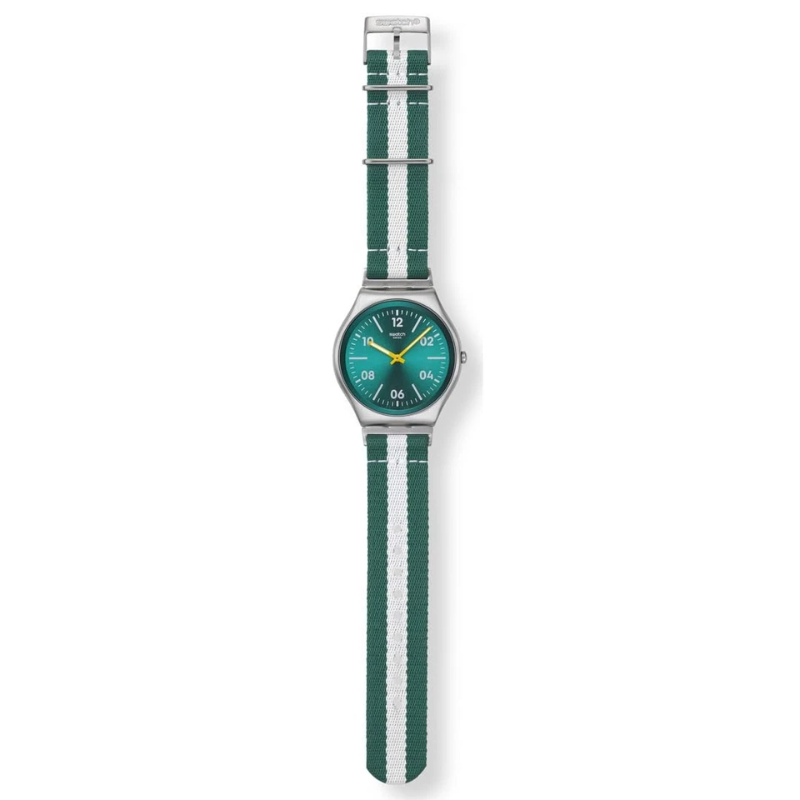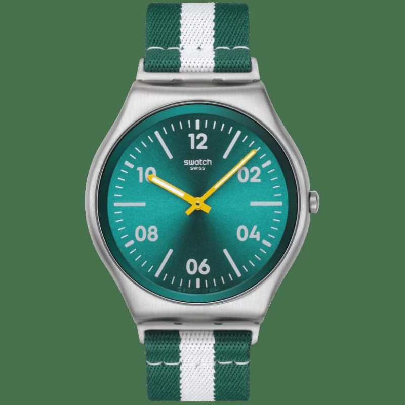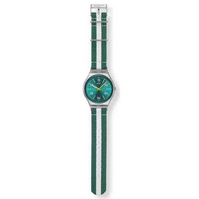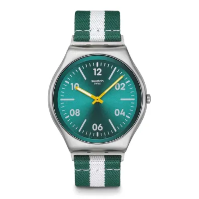 The Swatch CasualStripe SS07S149 is a modern take on the Skin Irony 42 collection, combining anultra-thin form with a refreshing green tone. The stainless steel envelopegives the watch an elegant touch, while the textile strap in a shade of greenemphasizes its casual, everyday style. The compact design makes the model fitperfectly on the wrist, offering high comfort. Hesalite glass protects theminimalist dial, while water resistance up to 30 meters protects the watch fromminor splashes.