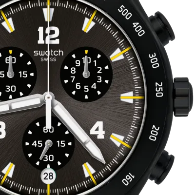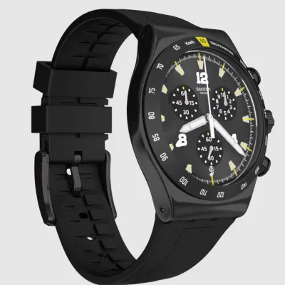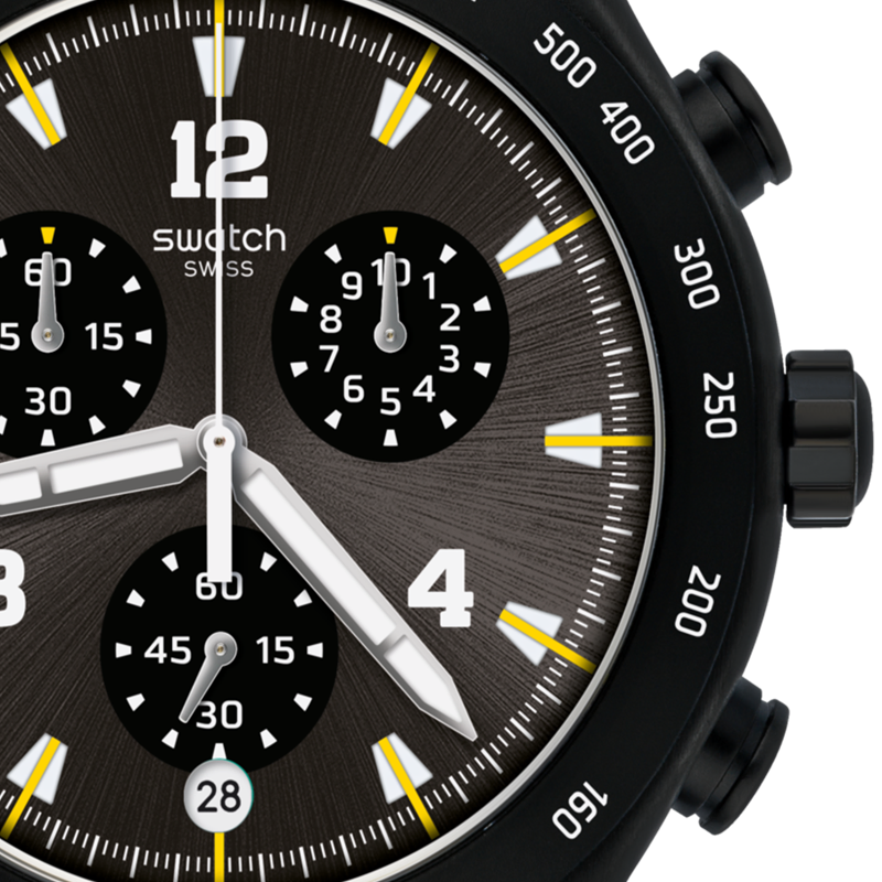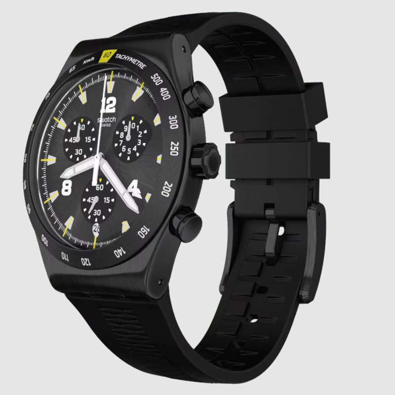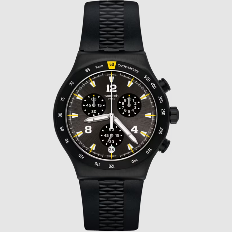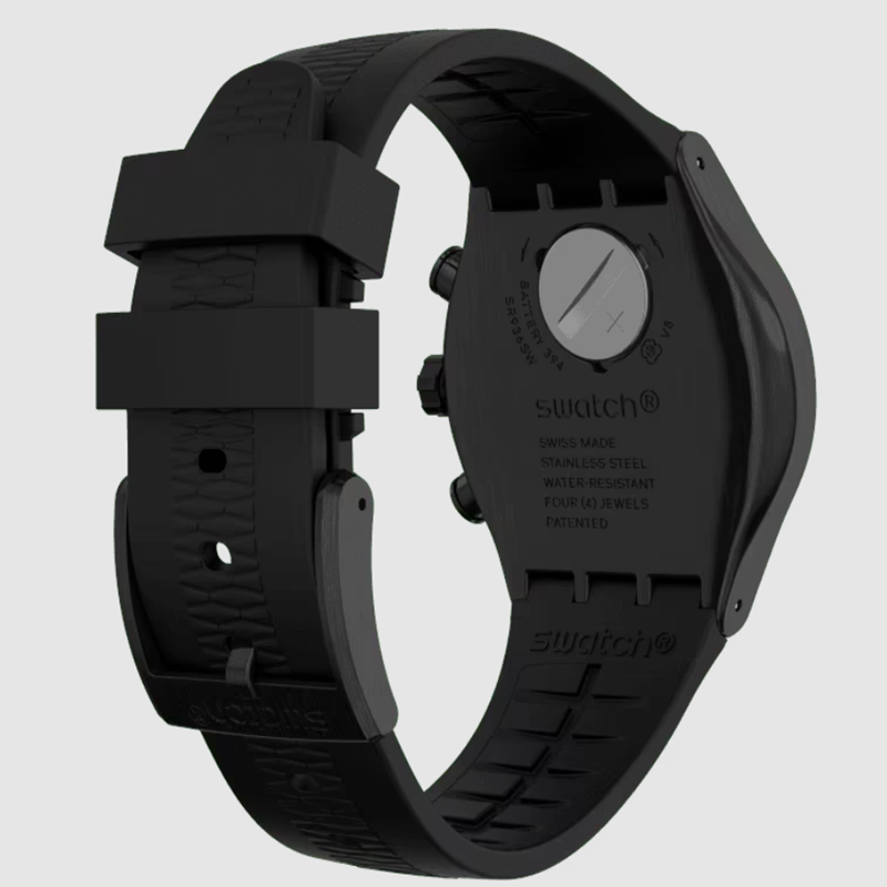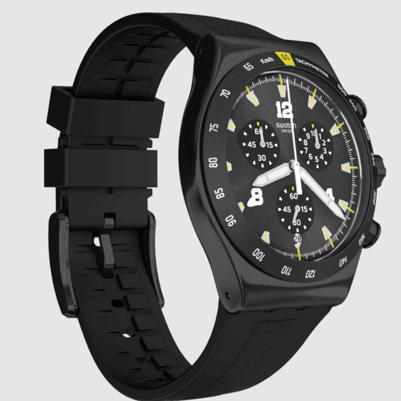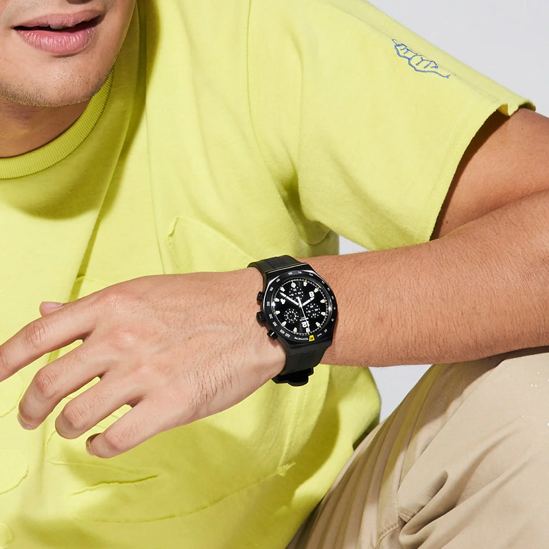 Black stainless steel case with a black rubber strap. Fixed black stainless steel bezel showing tachymeter markings. Black dial with luminous silver-tone hands and index hour markers.