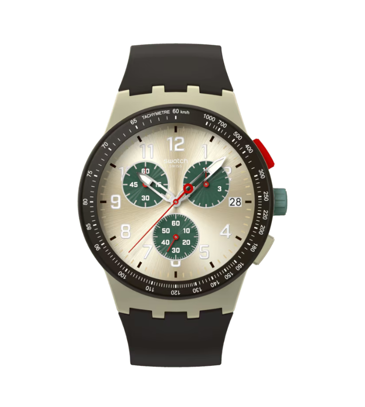 and sub dial hands and a date window at 3 o'clock. The matte beige case