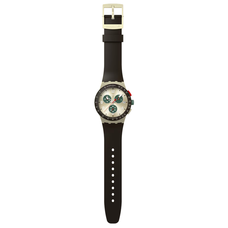 chronograph sports a sun brushed silver-colored dial with dark green sub dials,