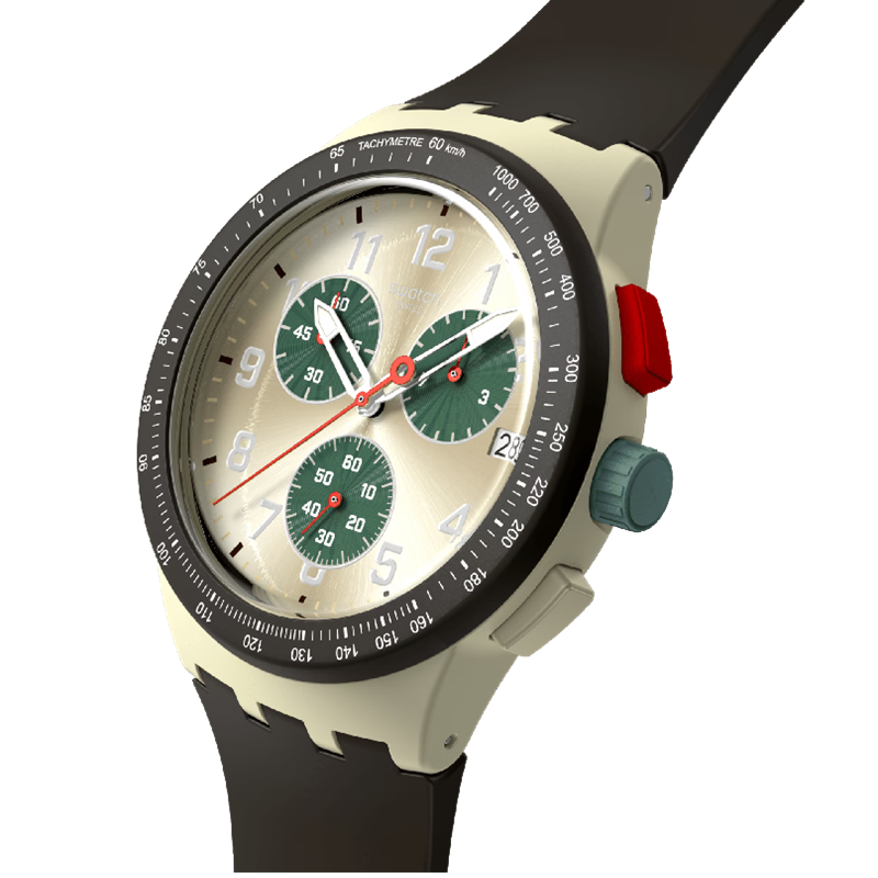 features a matte dark brown bezel with a white printed tachymeter scale and