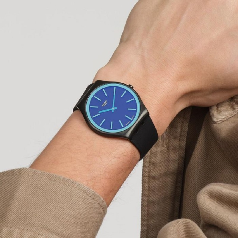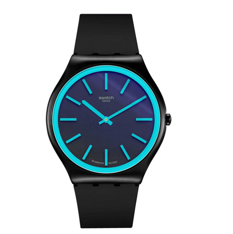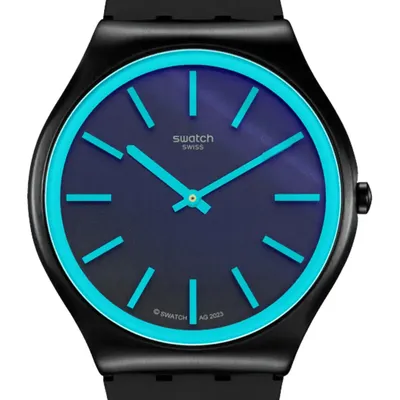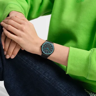 The black dial and blue hour and minute hands of this ultra-slimstainless steel watch shine under the Solar Spectrum effect glass featuringblue printed indexes. The brushed stainless steel case and buckle have blackPVD coating and are complemented by the black strap with a matching loop.