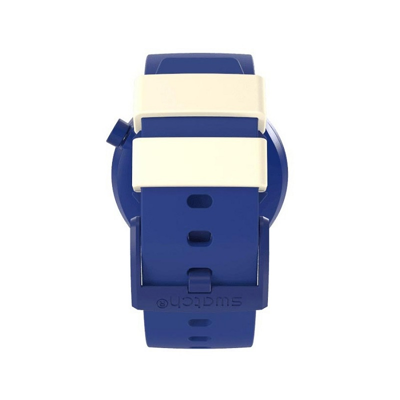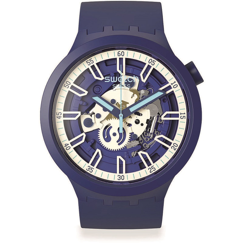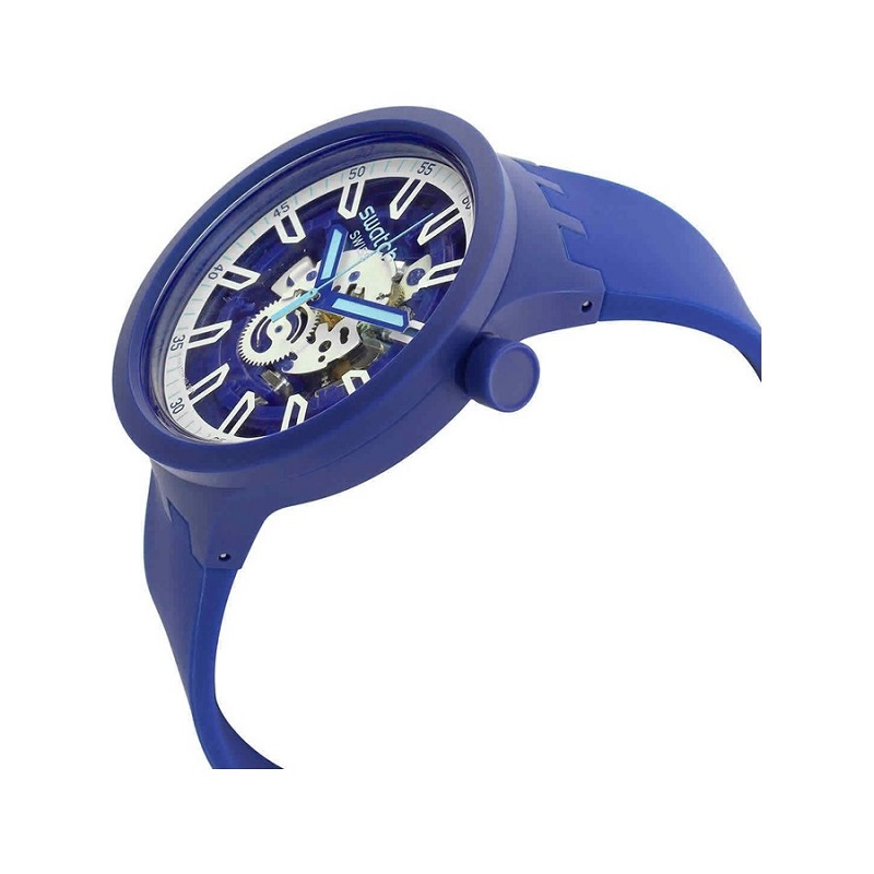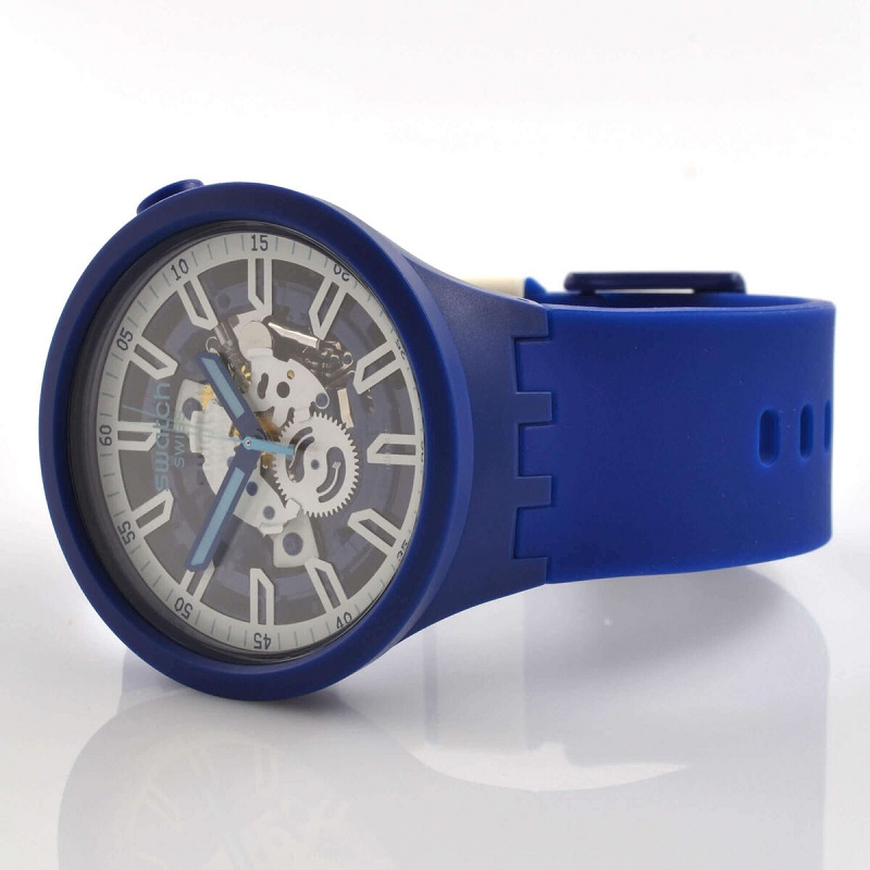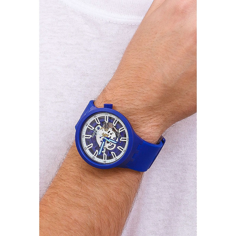 strap. The dial of this big face watch boasts blue hands with blue Swatch Glow.