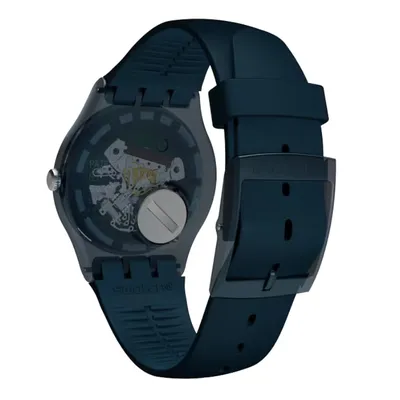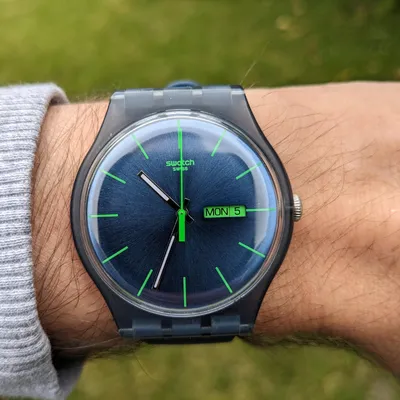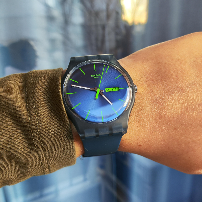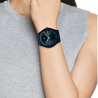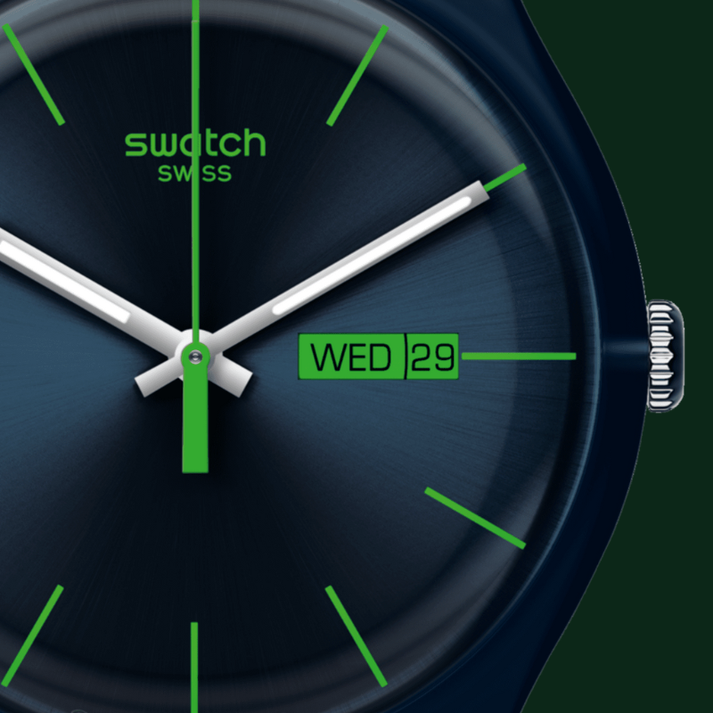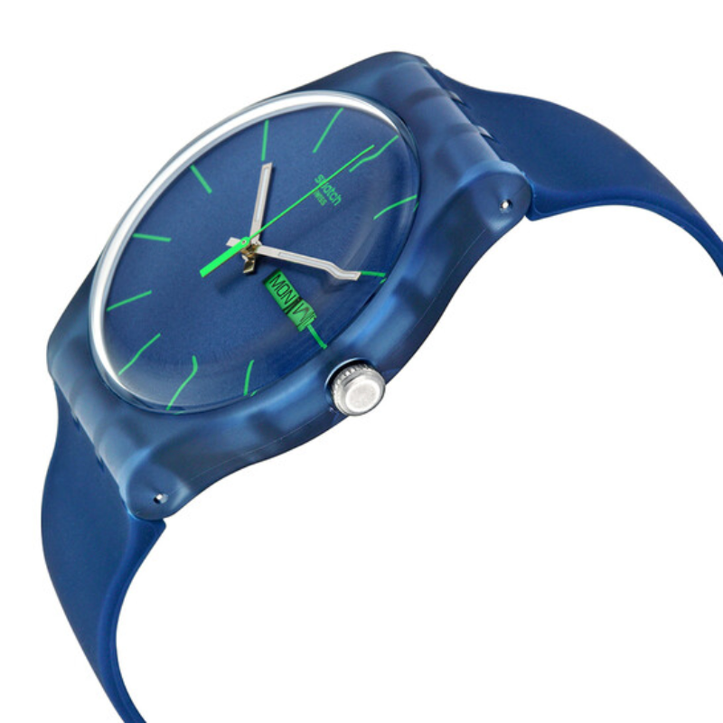 An elegant and evocative design uses color for mood and atmosphere. This fascinating New Gent presents a solid blue silicone strap and loop with a complementary transparent blue plastic case and matching buckle. The sun brushed blue dial present slim green indexes at all hours and a contrasting black-on-green day/date window at3 o’clock. In the absence of all numerals, shiny metal hour and minute hands with white superlight highlights and a slim, bright green seconds hand mark the time of day
