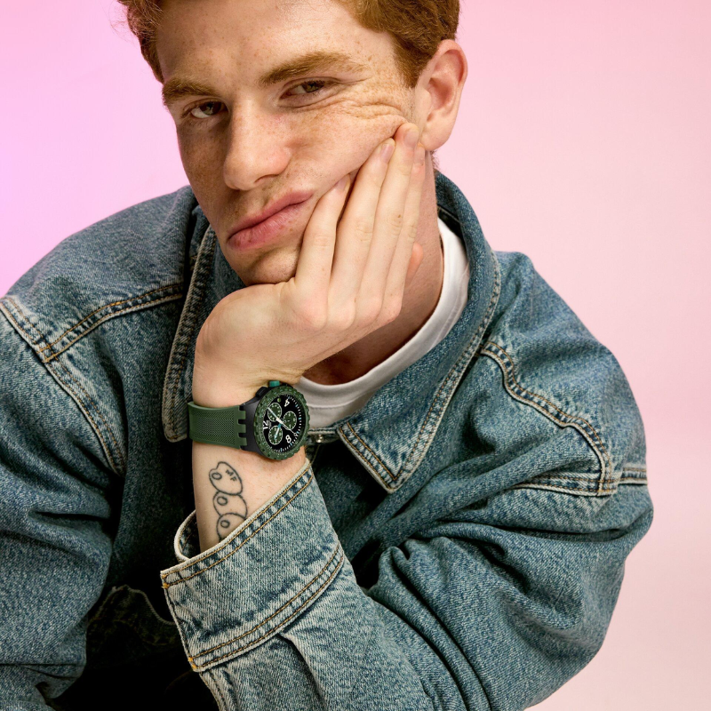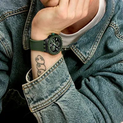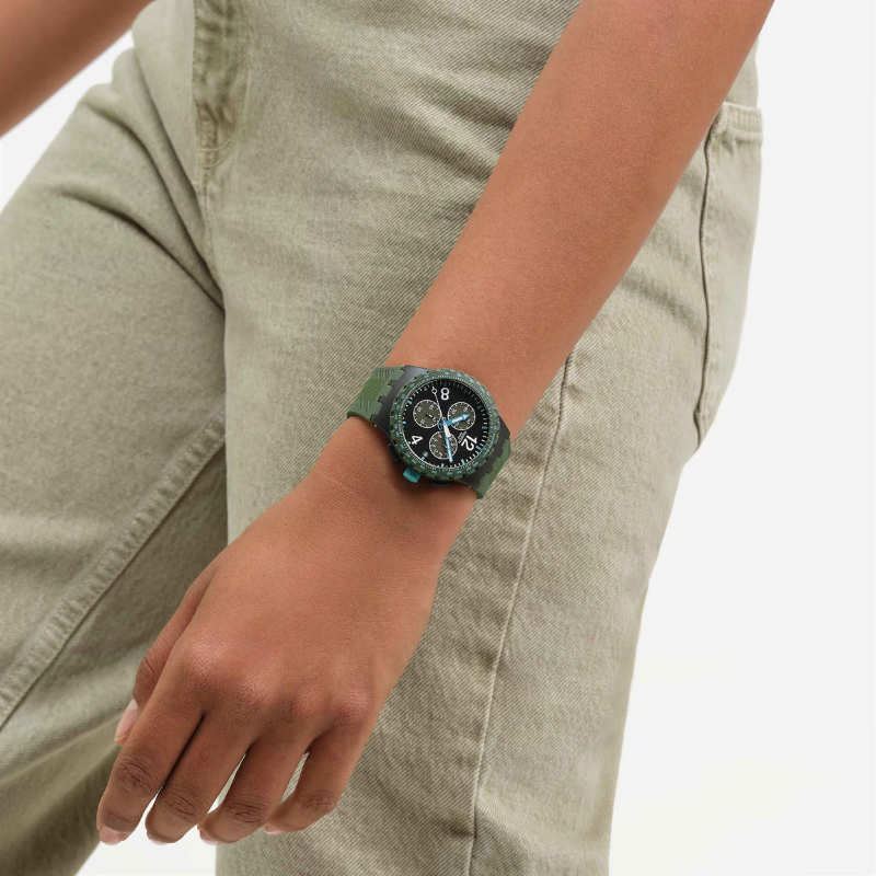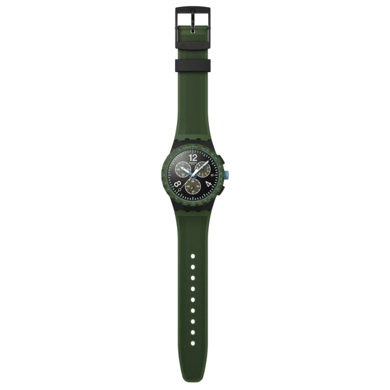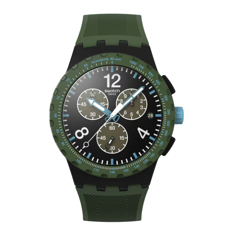 Sporty chronograph watch featuring a textured black dial with white numerals, light blue accents, luminous hands, dark green sub dials, and a date window at 3 o’clock. Finished with a matte black case, dark green tachymeter bezel, and a matching textured green strap with buckle for a bold, modern look.