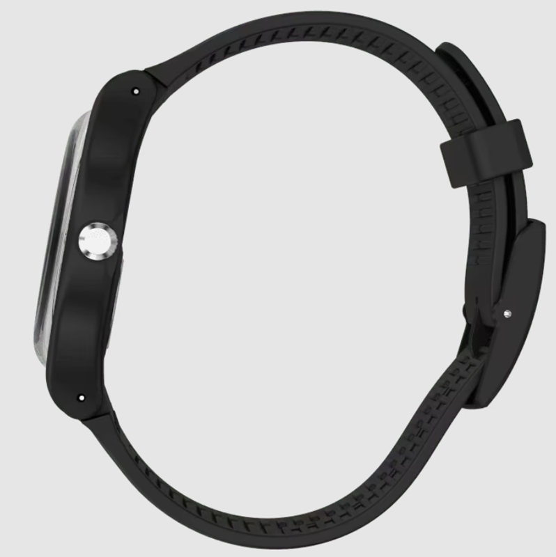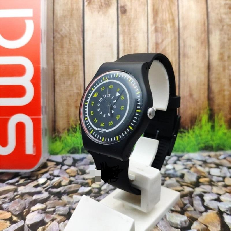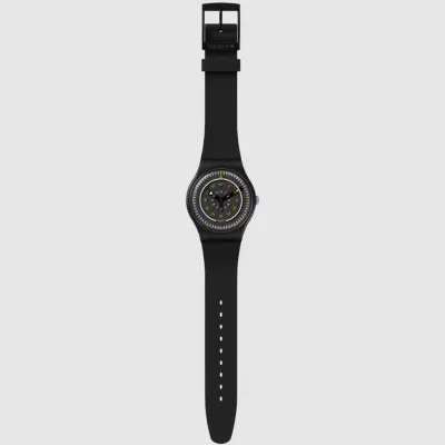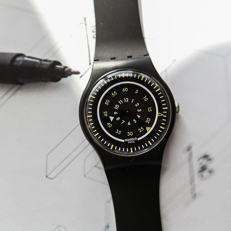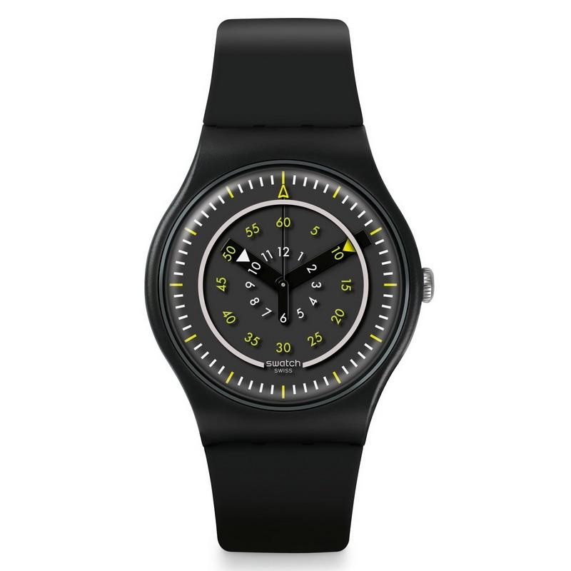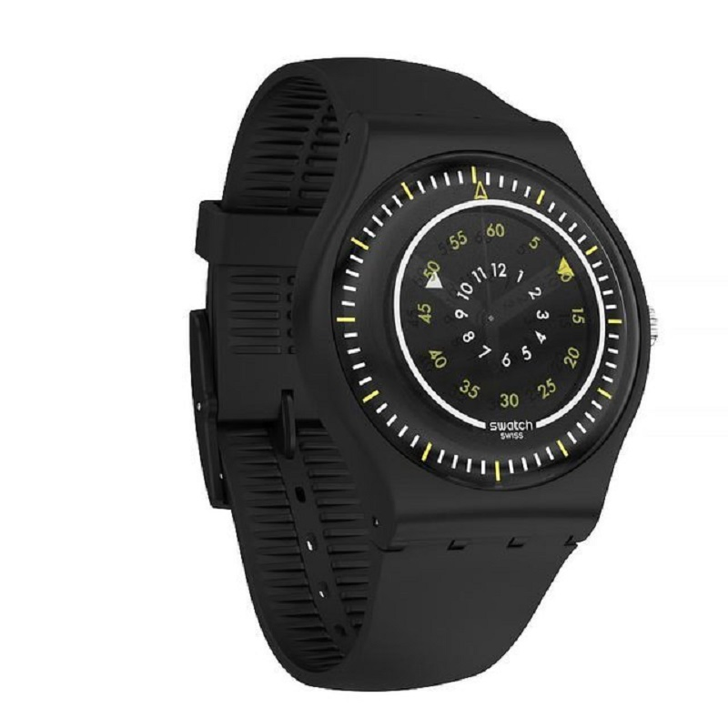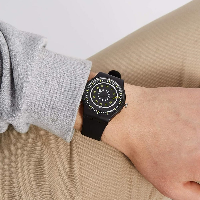 PIÙ NERO has a need for speed with black and yellow racing colors. White and seconds and hours in two inner circles yellow print on the glass stands out from the black background to reveal the