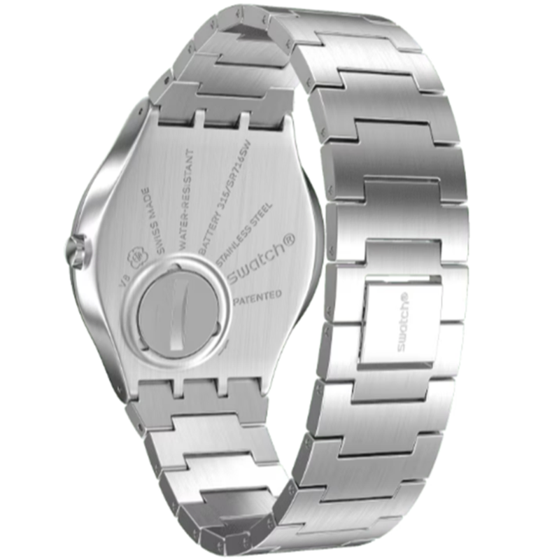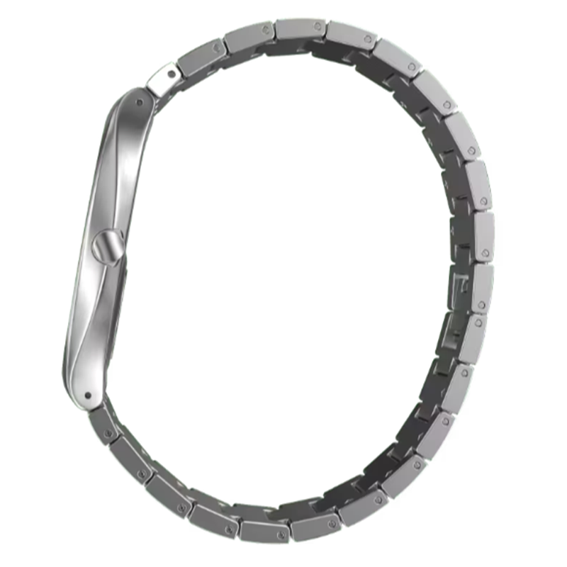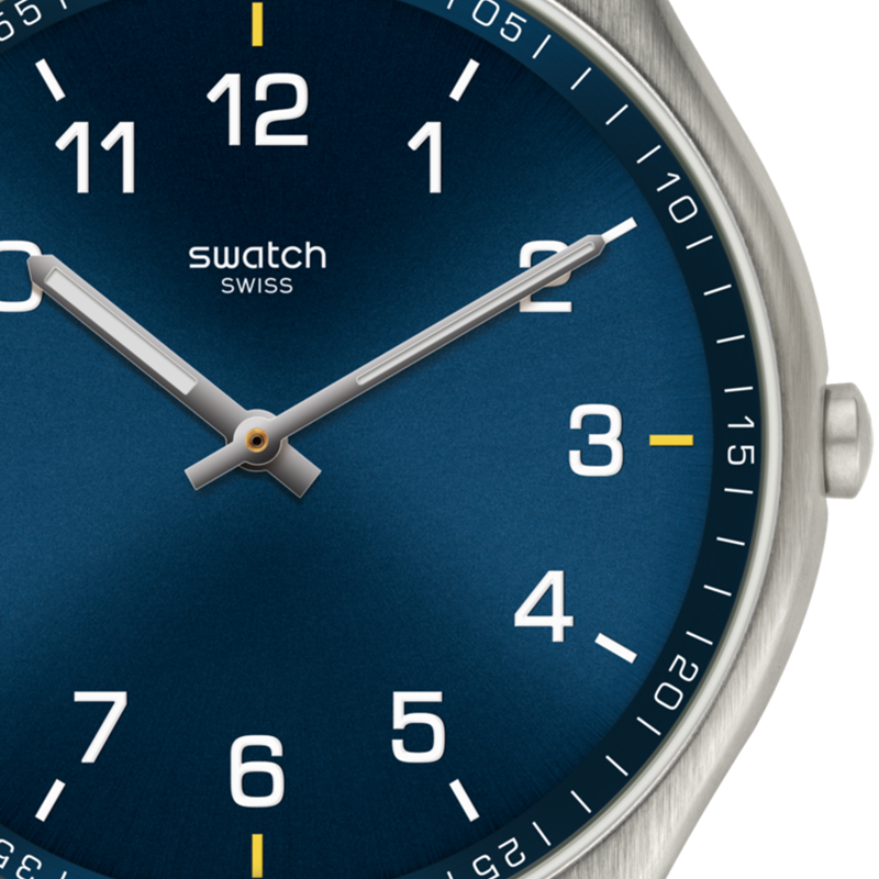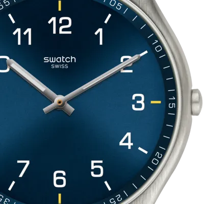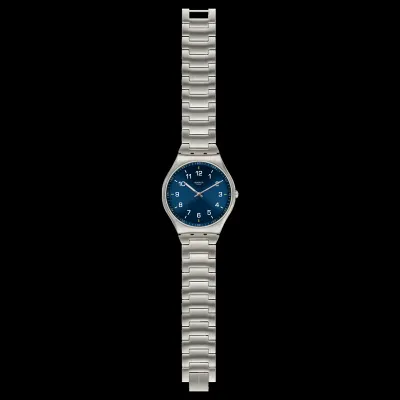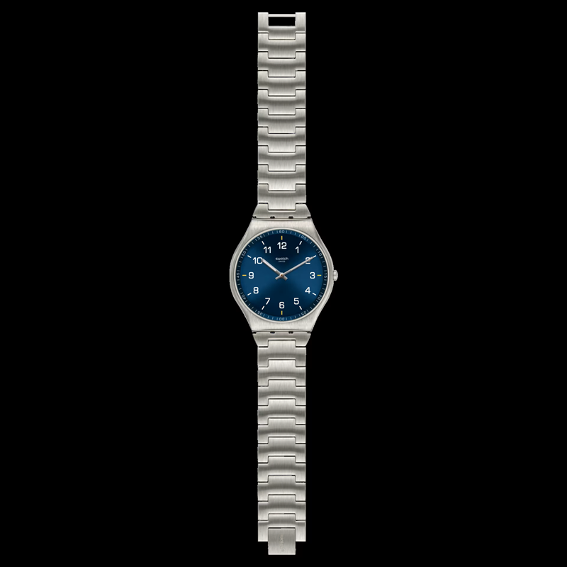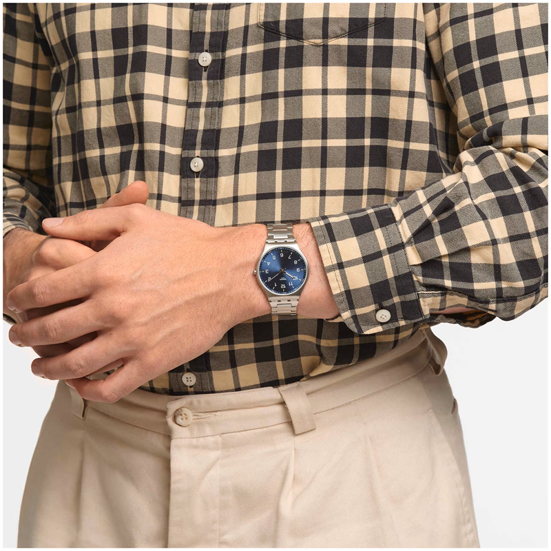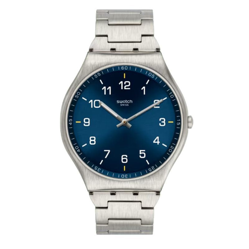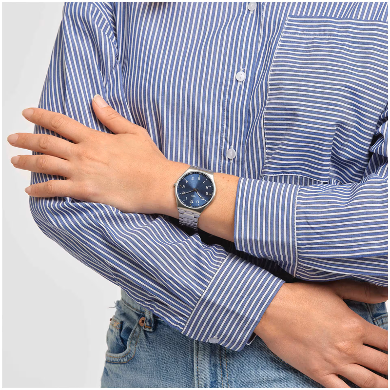 brushed metal bracelet and matching case. The sun-brushed blue dial has silvery