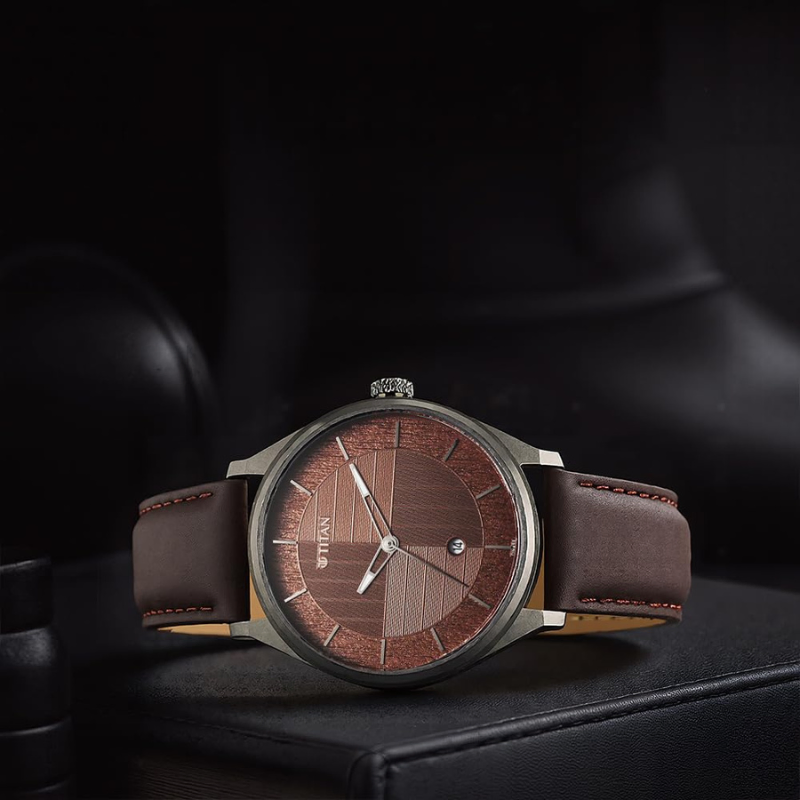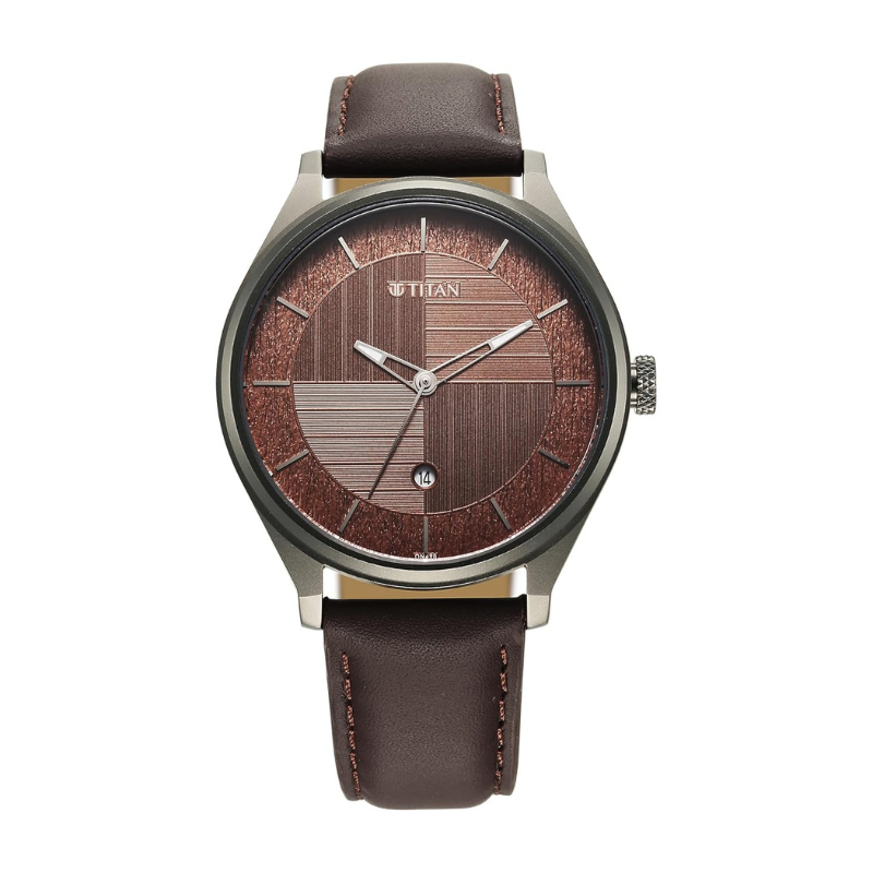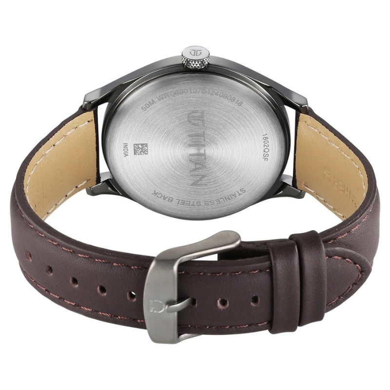 The Titan 1802QL02Men's Analog Watch combines contemporary style, a date display, and an accuratequartz movement for a sophisticated everyday and formal appearance. It has arichly textured brown dial and a matching brown leather strap.