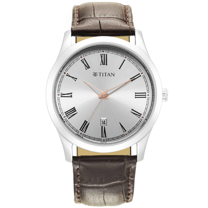 Refined and classic, the Titan 1823SL02 men’s watch featuresa sleek silver-white dial paired with a premium brown leather strap fortimeless elegance. Powered by precise quartz movement with a date display and50m water resistance, this stylish watch offers durability, comfort, andsophistication for office and every day wear.