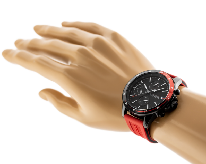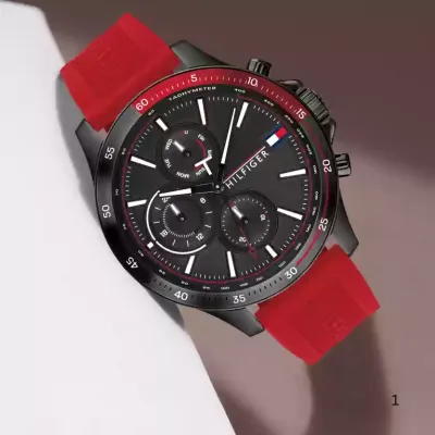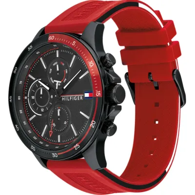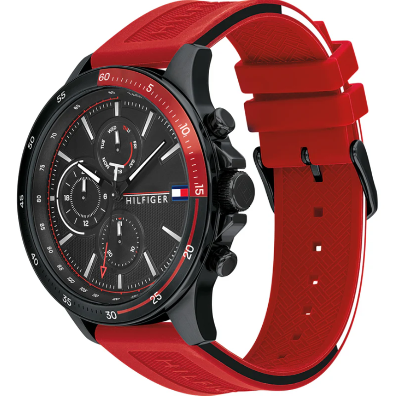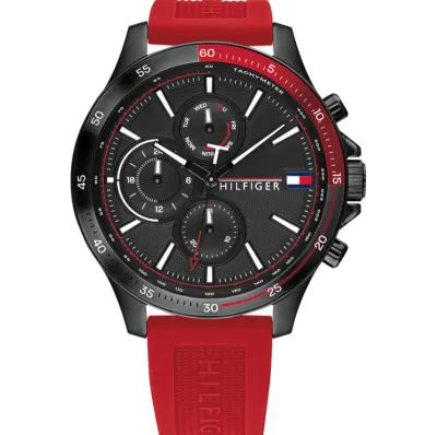 TheTommy Hilfiger black dial silicone men's watch is crafted with a black siliconeband and easy-to-read analog dial, this rugged timepiece is perfect for bothoutdoor and sports activities.