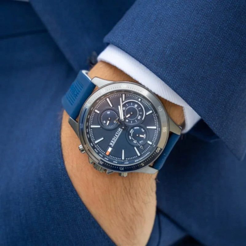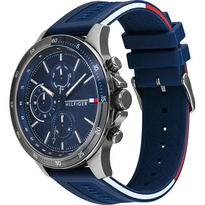 IntroducingTommy Hilfiger's Black Dial Silicone Men's Watch. Crafted with a black siliconeband and black easy-to-read analog dial, this rugged timepiece is perfect forboth outdoor and sports activities. Durable and long-lasting, this eye-catchingwatch is ideal for everyday wear.
