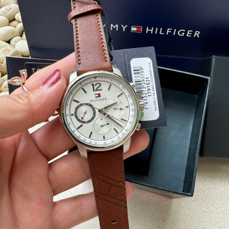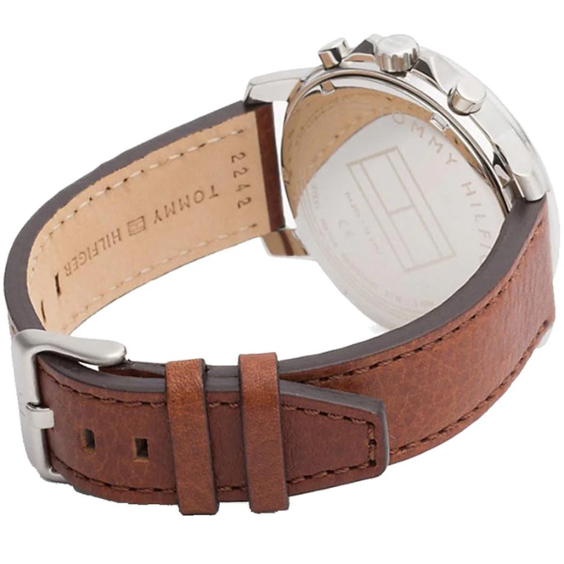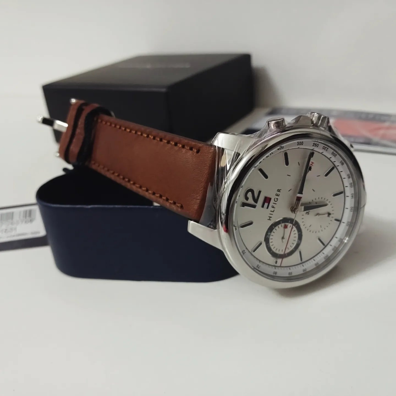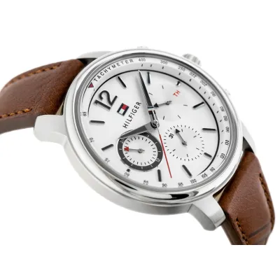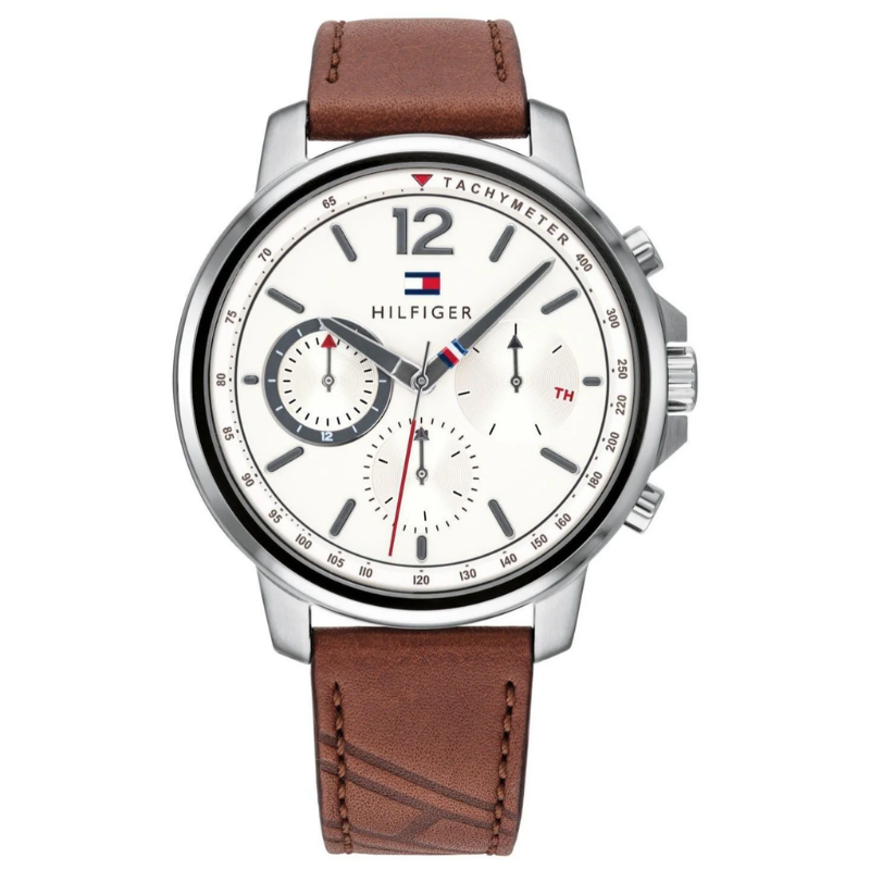 Expertly crafted with a sleek white dial and a brown leatherstrap, the Tommy Hilfiger Landon Chronograph watch (1791531) is a timeless andsophisticated timepiece. Featuring a reliable chronograph movement, this watchoffers both style and functionality for the modern man. Watch Movement Type:Quartz, dial glass material: mineral, Watch Display Type: Chronograph, WaterResistance Depth: 5 bars, Round case shape.44 mm case is sure to please. Themulti-eye dial features stick markers and an intricate minute track, detailedwith the Tommy Hilfiger flag Logo positioned at 12:00. The Leather strap isstamped with the iconic Tommy flag.