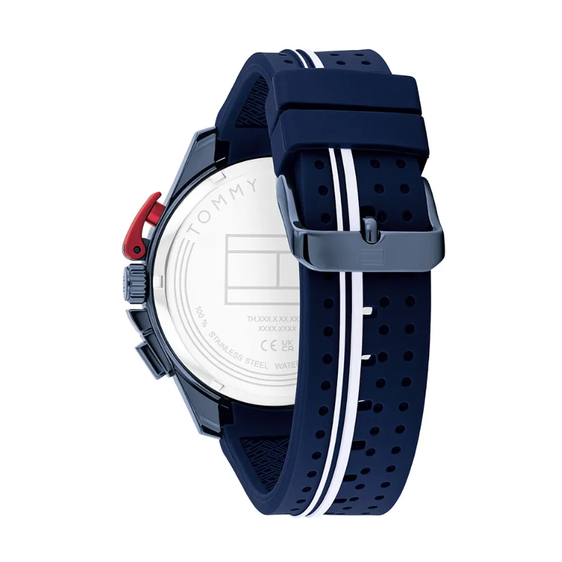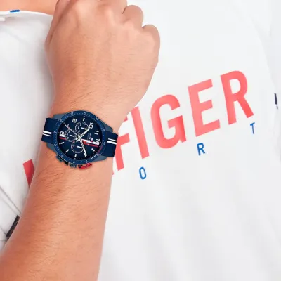 This Tommy Hilfiger men's chronograph watch delivers bold sporty style with its navy-blue dial, racing-inspired stripes, and durable silicone strap. Designed for performance and everyday comfort, it features multi-function sub dials, easy-to-read numerals, and signature Hilfiger detailing. A perfect blend of athletic design and modern fashion, ideal for casual and active wear.