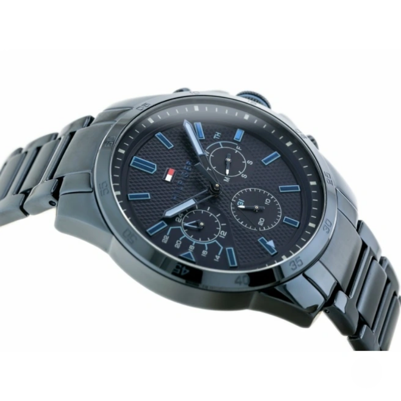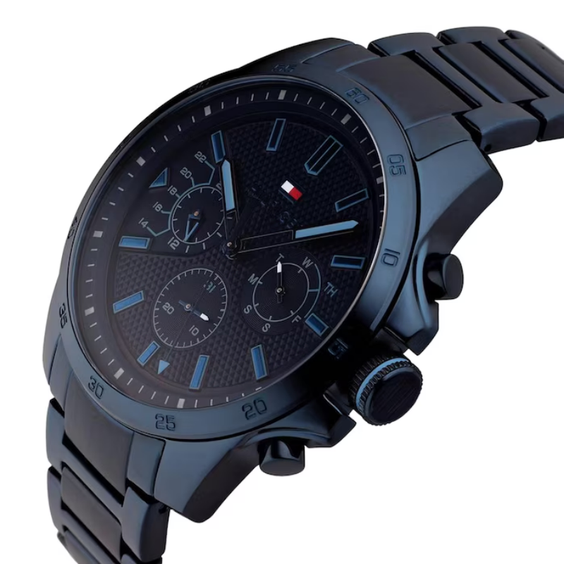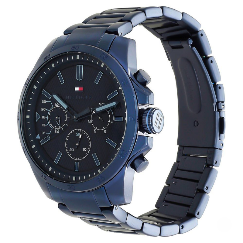 TommyHilfiger Decker Blue Dial Men's Watch. Set a trend among the crowd by wearingthis men’s analog watch from tommy hilfiger. The navy round dial exudes plainthree hands, bold stick markings at five minute intervals, three sub dials, twopushers and a crown for time adjustment. Furthermore, the stainless steel strapvaunts a navy hue that enhances the look of the watch.