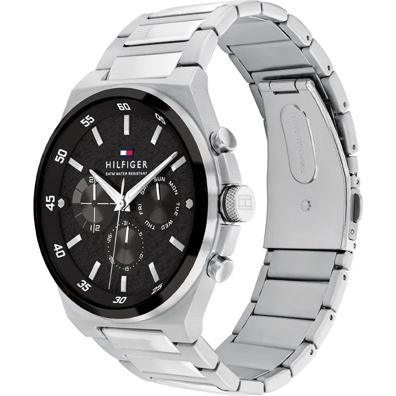 ThisTommy Hilfiger watch has a case made of stainless steel with a diameter of 46mm and is fitted with a metal band. Inside the case lies a Seiko InstrumentsInc. movement and the watch features a Mineral crystal. The watch is 5ATM. This means the watch is suitable for showering.